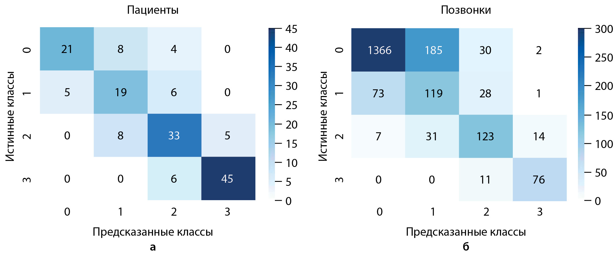 6. Рисунок 6. Таблицы сопряженности классификации позвонков (а) и пациентов (б) по степеням компрессионных переломов, произведенной моделью Comprise-G. Строки — степени компрессии по данным экспертной разметки, столбцы — по измерениям модели | |