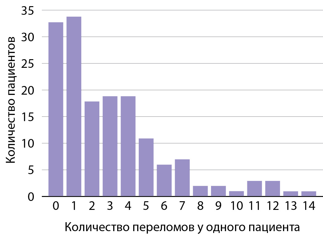 8. Рисунок 8. Распределение пациентов по количеству переломов (всех степеней) согласно экспертной разметке N=160. | |