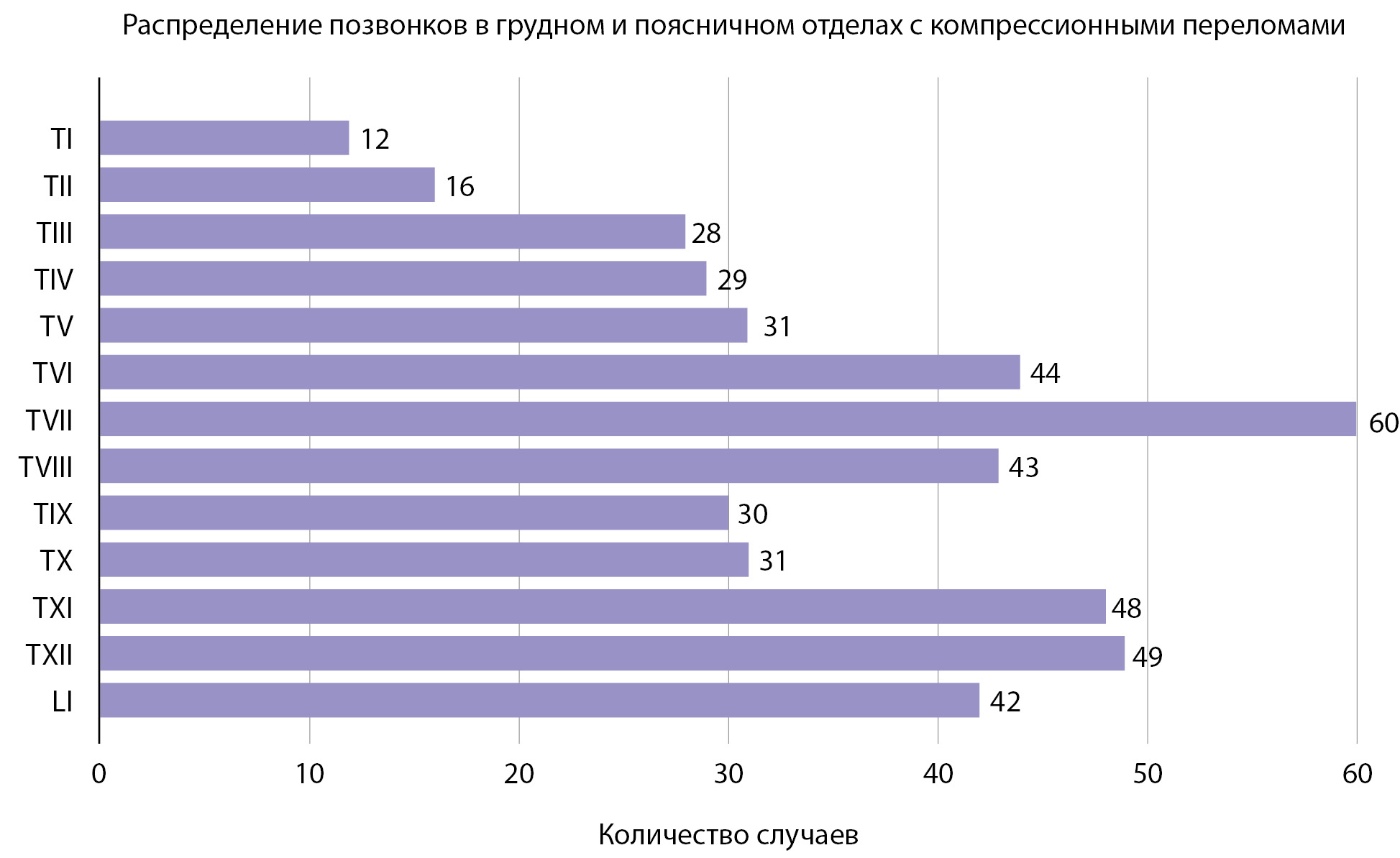 9. Рисунок 9. Распределение количества позвонков с компрессионными переломами в грудном отделе позвоночника и первом поясничном позвонке (экспертная разметка), N=160. | |