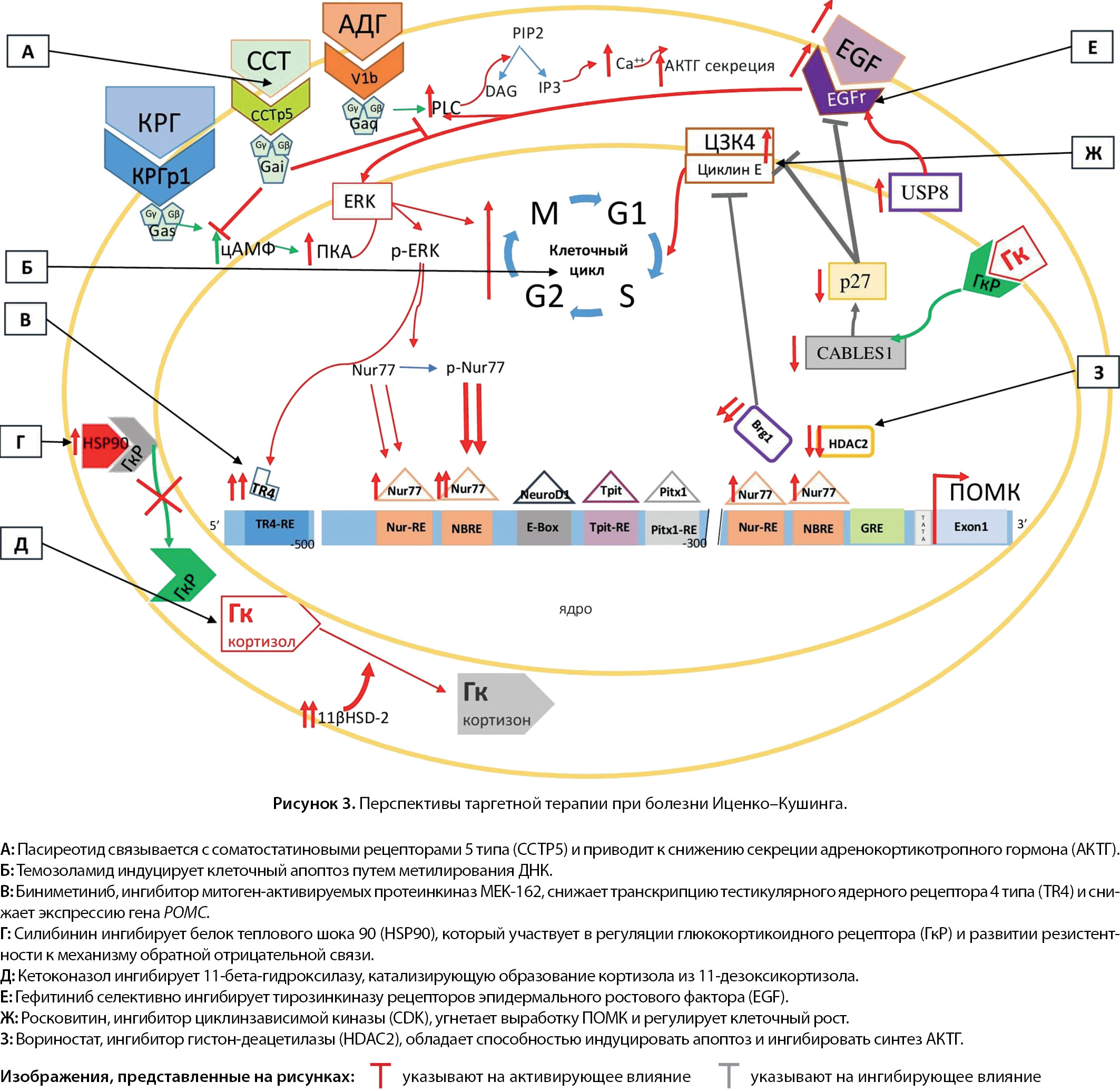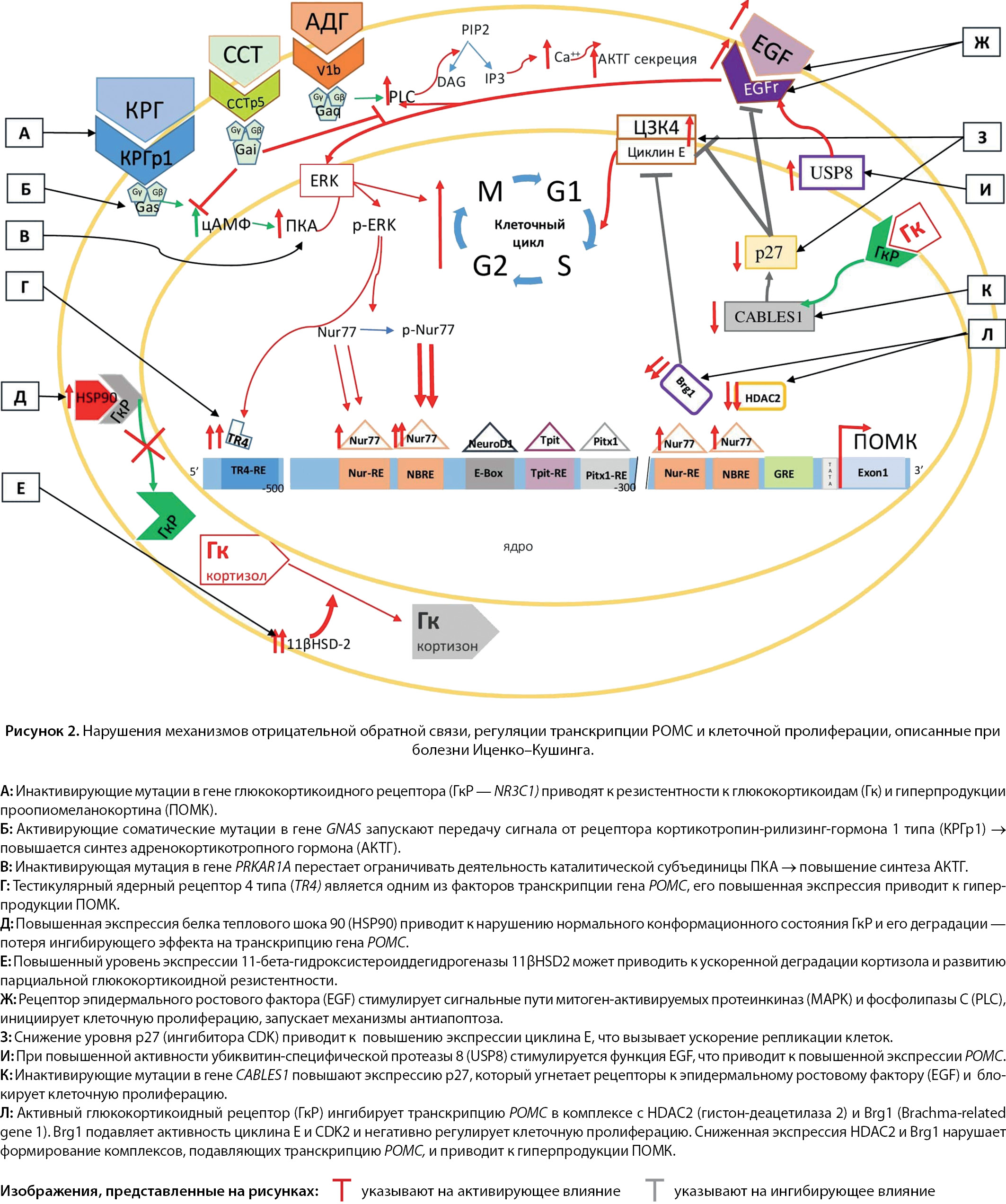 2. Рисунок 2. Нарушения механизмов отрицательной обратной связи, регуляции транскрипции POMC и клеточной пролиферации, описанные при болезни Иценко–Кушинга.