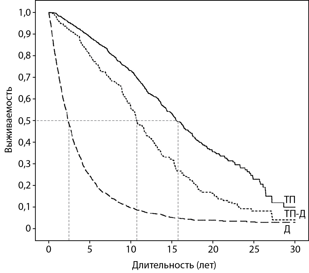 1. Рисунок 1. Выживаемость пациентов с сохранной функцией почечного трансплантата (873 чел.; ТП), пациентов, начавших лечение диализом после утраты почечного трансплантата (273 чел.; ТП-Д), и пациентов, находящихся на лечении диализом (1273 чел.; Д), с момента начала лечения диализом (оценка по Kaplan–Meier) [13].