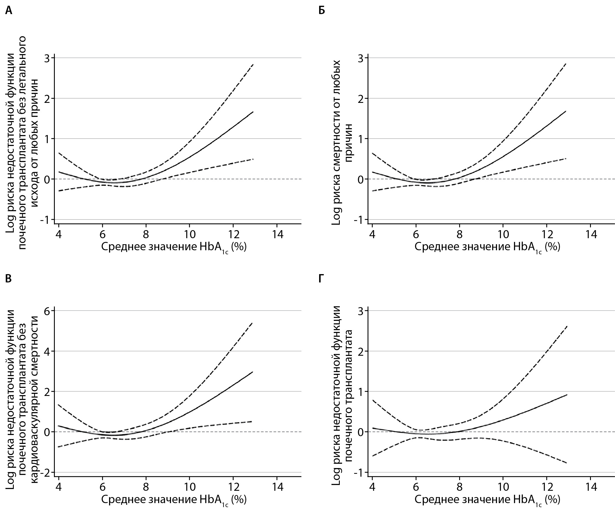 2. Рисунок 2. Относительный риск (95% ДИ) недостаточной функции почечного трансплантата без летального исхода от любых причин (А), смертности реципиентов от любых причин (Б), недостаточной функции почечного трансплантата без кардиоваскулярной смертности (В) и недостаточной функции почечного трансплантата без летального исхода (Г) в зависимости от среднего значения HbA1c перед пересадкой почки у 2872 диализных пациентов с сахарным диабетом при наблюдении в течение 6 лет после трансплантации почки (регрессионный анализ по Cox) [27].