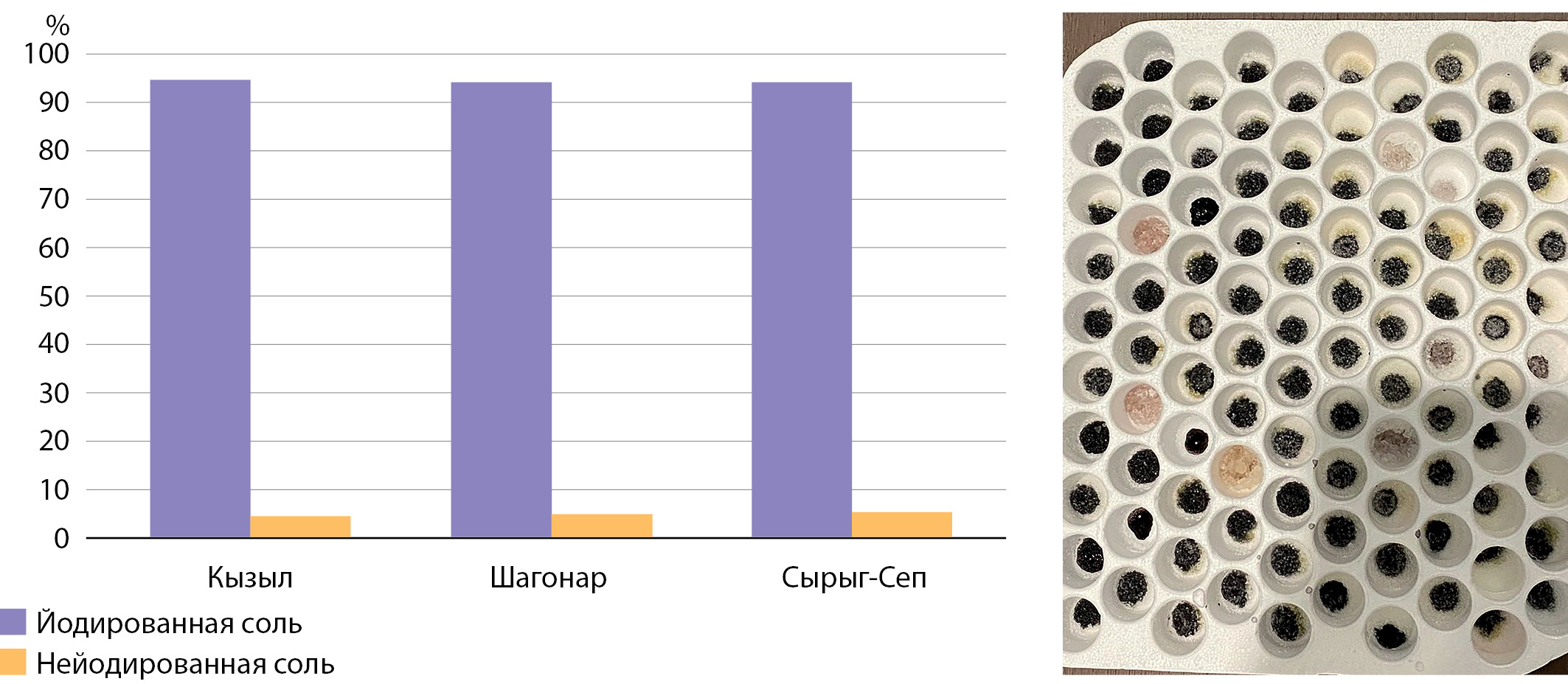 Рисунок 3. Результаты определения наличия йода в пищевой соли из домохозяйств (синее окрашивание образцов соли подтверждает наличие йодата калия).