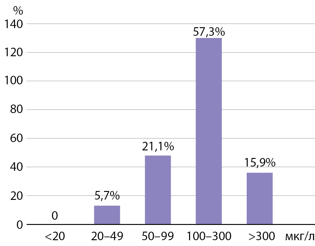 мКЙМ у школьников составила 153 мкг/л, что соответствует целевым значениям и подтверждает достаточное его потребление. Частотное распределение показателей концентрации йода в моче в обследованной выборке представлено на рисунке 2.