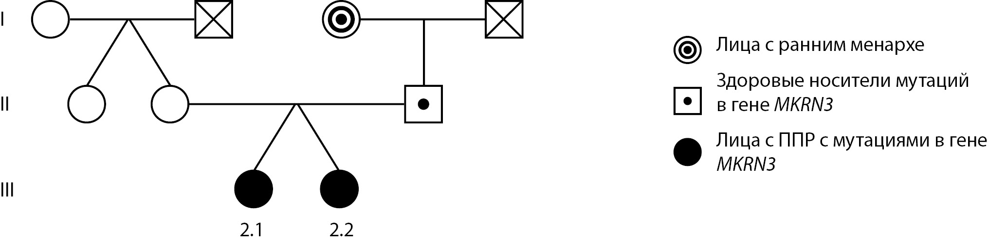 В семье 2 диагноз установлен у двух сестер (пробанды 2.1 и 2.2) из дихориальной диамниотической двойни. У бабушки по линии отца менархе в 10 лет (рис. 2).