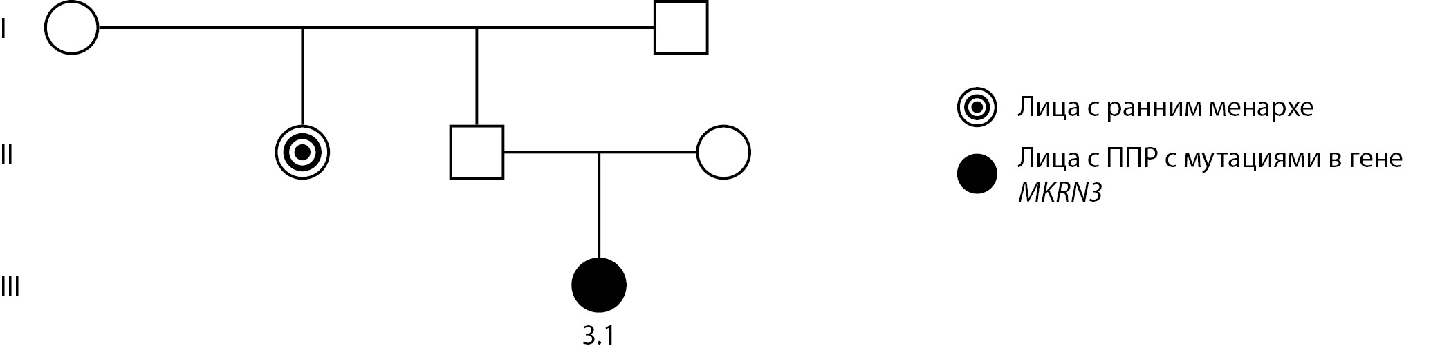 В семье 3, наряду с пробандом (девочка 3.1) с ППР, раннее менархе (9 лет) диагностировано у тети по линии отца, данных о возрасте начала пубертата у отца нет (рис. 3).