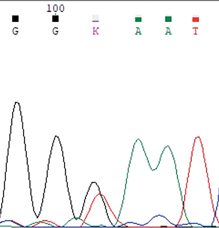 Рисунок 4. Электрофореграмма фрагмента последовательности экзона 1 гена MKRN3 у членов семьи 1: гетерозиготная трансверсия c.118G>T с заменой кодона глутаминовой кислоты (GAA) на стоп-кодон (TAA) в положении 40 (p.E40X).