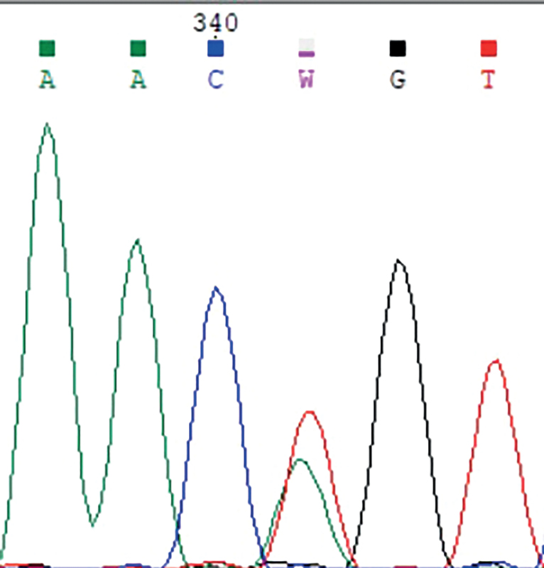 Рисунок 5. Электрофореграмма фрагмента последовательности экзона 1 гена MKRN3 у членов семьи 2: гетерозиготная трансверсия c.343T>A с заменой кодона цистеина (TGT) на серин (AGT) в положении 115 (p.C115S).