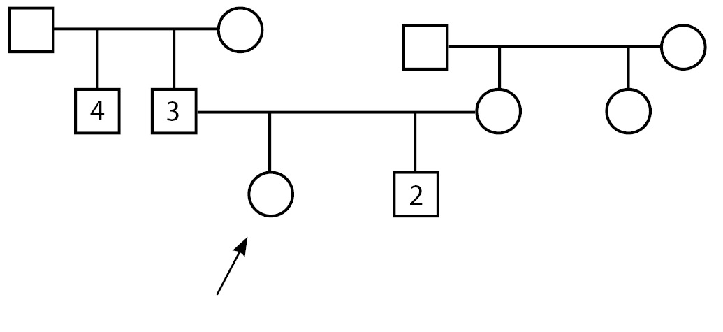 Примечание: у родного брата пробанда (2) — врожденная колобома, левосторонняя микрофтальмия, подковообразная почка, в анамнезе комбинированное лечение по поводу герминомы левого яичка, с 17 лет — гормональная заместительная терапия препаратами эфира тестостерона; у отца (3) — гипоосмия, задержка полового развития в анамнезе; у дяди по отцовской линии (4) — два бесплодных брака (не обследован).