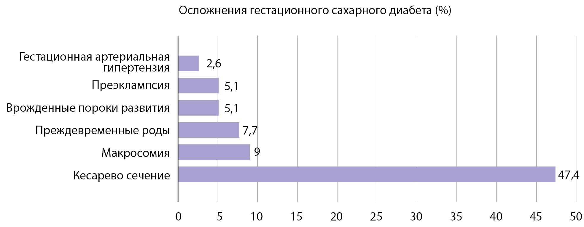 Анализ структуры факторов риска у беременных с ГСД показал, что это: возраст более 30 лет (73,1%), отягощенная наследственность по СД2 (30,8%), ИМТ до беременности, соответствующий избыточной массе тела/ожирению (26,9%). Была изучена частота осложнений беременности и ее исходов в группе данных пациенток. Частота родоразрешения путем операции КС составила 47,4%; макросомии — 9%; преждевременных родов — 7,7%, из чего можно сделать вывод, что пациентки, страдающие ГСД, требуют более тщательного наблюдения за течением беременности, состоянием плода и своевременной госпитализации для подготовки к родоразрешению при наличии макросомии, что снижает риск травматизации плода во время родов.