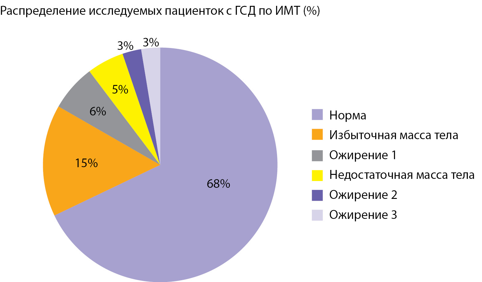 Высокий ИМТ до наступления беременности имели 26,9% исследуемых. Стоит отметить, что также присутствовали пациентки с дефицитом массы тела (5%). Более подробная информация по характеристикам ИМТ представлена на круговой диаграмме (рис. 3).