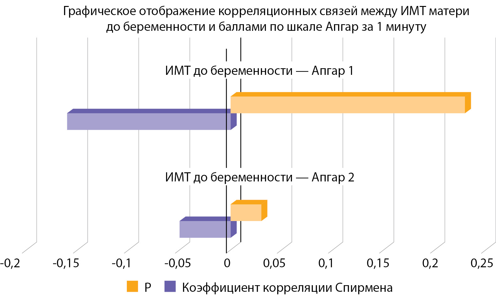 Таблица 5. Оценка корреляционной зависимости между индексом массы тела матери до беременности и баллами по шкале Апгар на 1-й и 5-й минутах