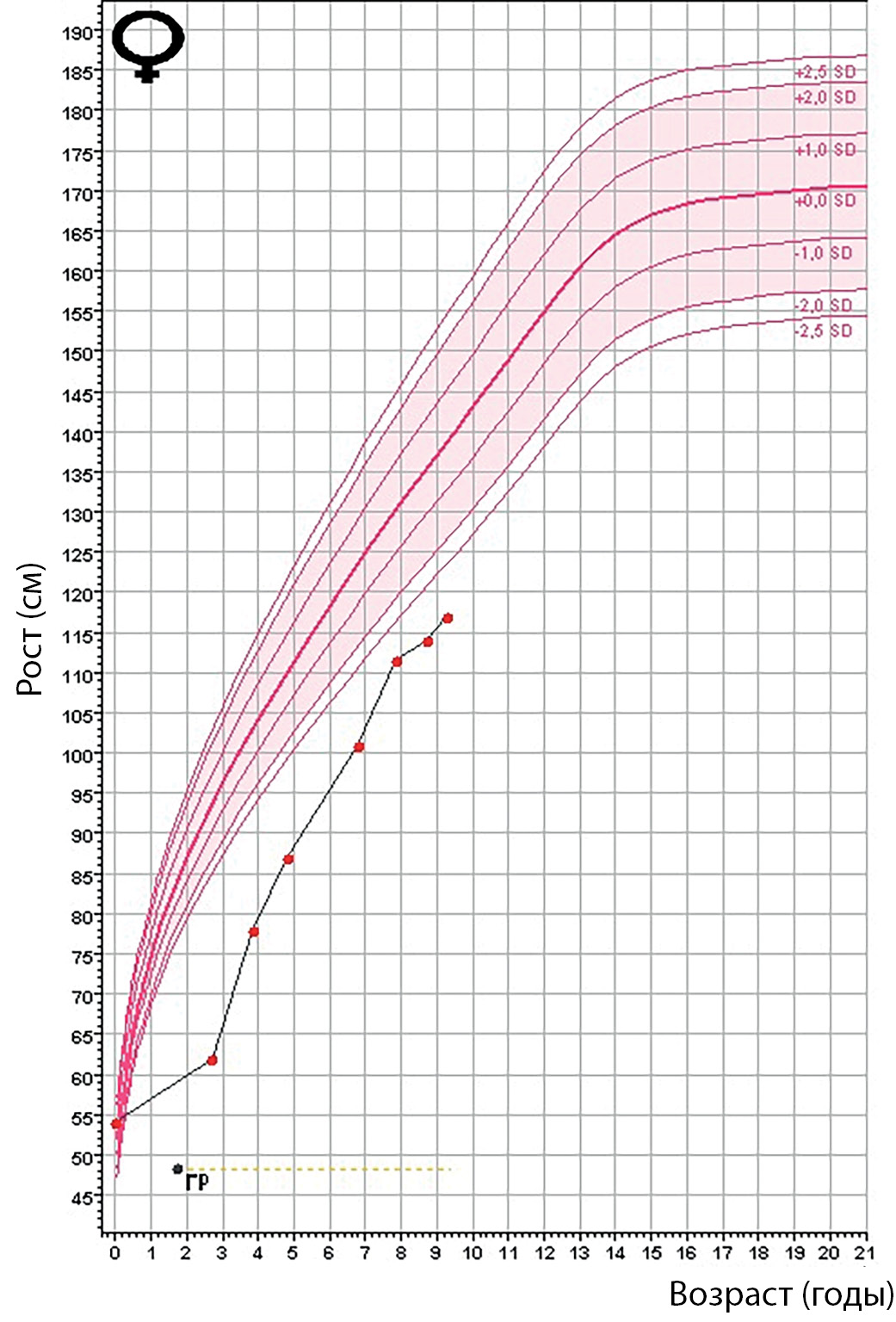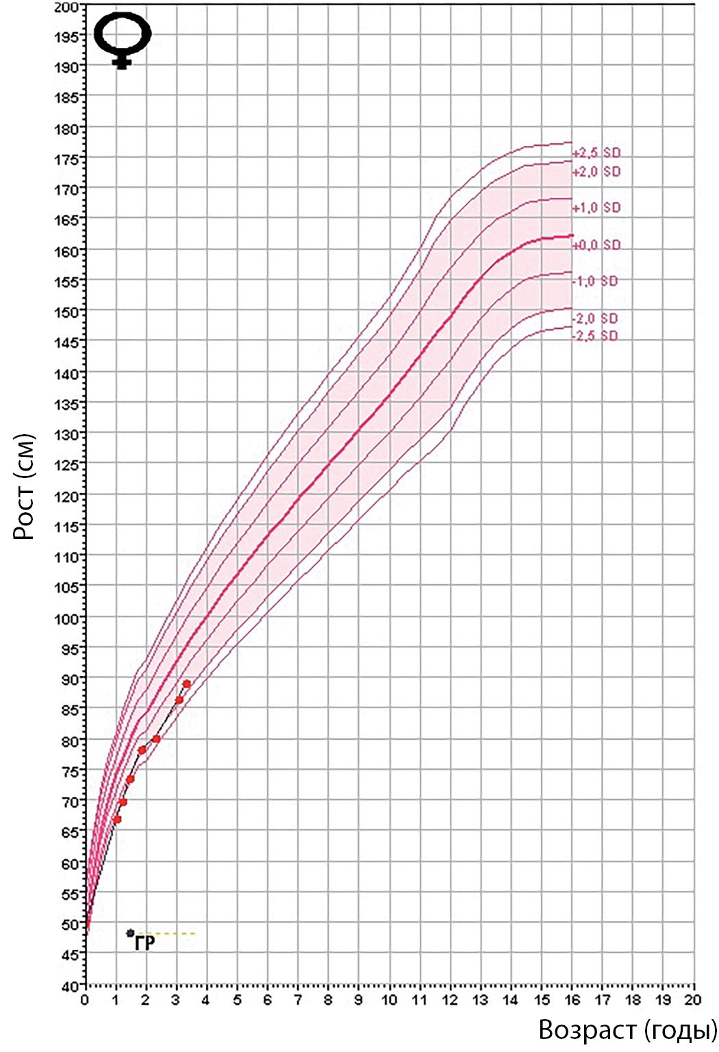 Девочка родилась от 1-й беременности, срочных родов. При рождении рост и вес соответствовали сроку гестации (см. табл. 1), оценка по шкале Апгар 8/9 баллов. В возрасте 16 ч жизни переведена в отделение реанимации и интенсивной терапии в связи с дыхательными нарушениями (внутриутробная пневмония). В неонатальном периоде отмечалась гипербилирубинемия, эпизодов гипогликемий не зафиксировано. Обращали на себя внимания фенотипические особенности: брахицефальная форма головы, широкая переносица, короткий нос, гипоплазия средней части лица, узкая верхняя губа, опущенные вниз уголки губ, низкорасположенные диспластичные уши, короткая шея, сосковый гипертелоризм, пупочная грыжа, частичная синдактилия 2–3 пальцев стоп, клинодактилия 5 пальцев стоп. С первых месяцев жизни обращали на себя внимание мышечная гипотония, задержка психомоторного развития (голову держит с 4 мес, переворачивается с 6 мес), по поводу которых наблюдалась неврологом и генетиком. В возрасте 8 мес по результатам микроматричного анализа ДНК была диагностирована частичная моносомия по длинному плечу 18 хромосомы (дистальная делеция — 18q22-q23), в связи с чем пациентка была направлена на консультацию к эндокринологу. По данным обследования в гормональном профиле отклонений не было выявлено, отмечалось умеренное снижение ИФР -1 (см. табл. 2). Костный возраст соответствовал паспортному.