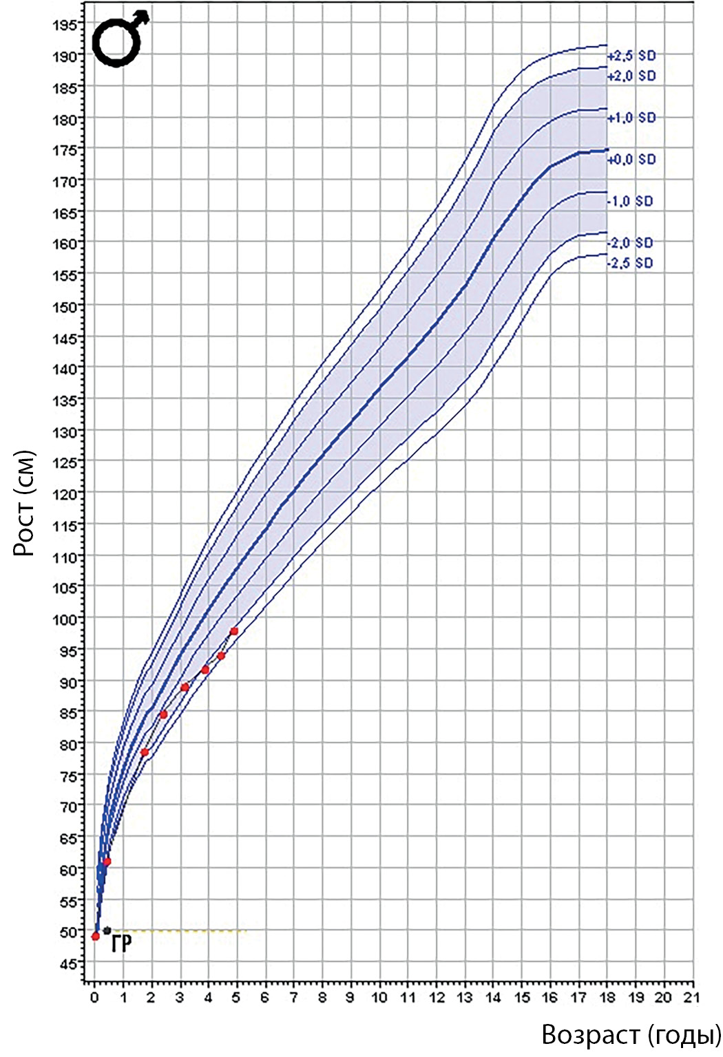В возрасте 1 год 4 мес, несмотря на реабилитационные мероприятия, сохранялась мышечная гипотония, в связи с чем было принято решение об инициации терапии гормоном роста с метаболической целью (0,01 далее 0,025 мг/кг/сут) по решению консилиума. Стимуляционные пробы не проводились ввиду маленького возраста ребенка. На фоне лечения гормоном роста отмечалось нарастание одышки, терапия была прервана на 3 мес. После отмены симптомы дыхательных нарушений исчезли, ребенок был консультирован торакальным хирургом, выявлено неправильное стояние диафрагмального купола по данным рентгенографии. При динамическом наблюдении в возрасте 3 лет отмечалось снижение темпов роста (SDS роста=-2,13). Было выявлено снижение уровня ИФР-1 до 49,8 нг/мл, и терапия гормоном роста была возобновлена в метаболической дозе с постепенным наращиванием до 0,033 мг/кг/сут, ввиду высокой вероятности СТГ-дефицита. При оценке темпов роста на фоне лечения наблюдалась положительная динамика (рис. 7). Побочных эффектов от терапии гормоном роста в дальнейшем не отмечено.