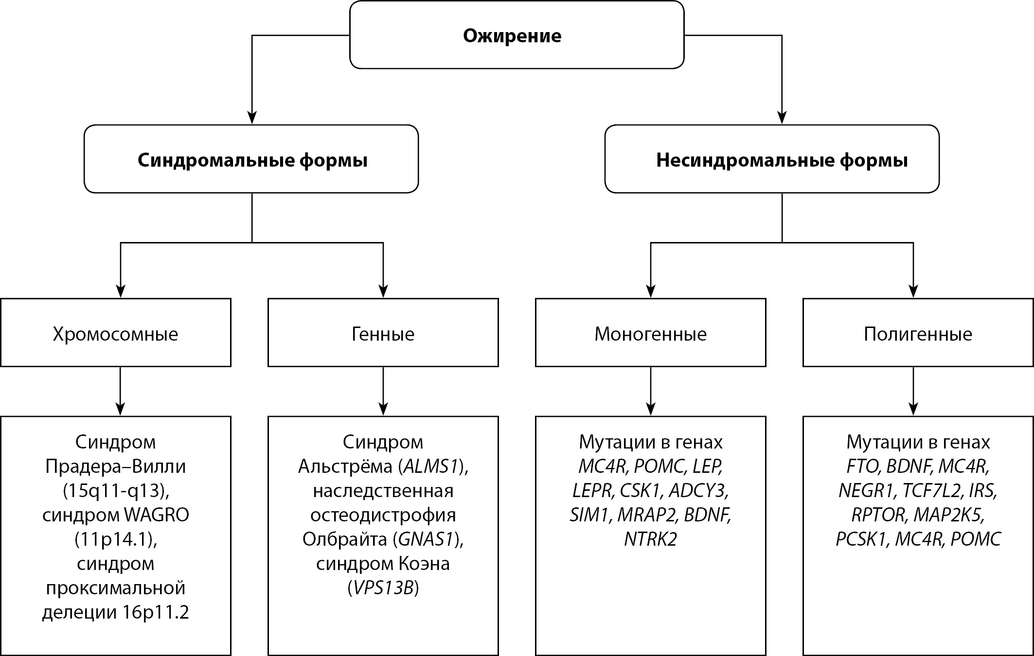 Несмотря на значимость влияния факторов внешней среды, нельзя недооценивать роль генетического компонента в развитии ожирения. В ходе ранних семейных [8–11] и близнецовых [12–14] исследований было установлено, что вклад генетических факторов в вариабельность ИМТ может достигать 70–80%. Популяционные исследования распространенности ожирения в различных этнических группах также подчеркивают влияние генетических особенностей [15]. В то время как в ряде случаев ожирение является составной частью различных хромосомных синдромов и результатом влияния мутаций отдельных генов (рис. 1), по большей части, по-видимому, развитие ожирения обусловлено сложным взаимодействием внешних факторов, способствующих ожирению (“obesogenic environment”) и индивидуальной наследственной предрасположенности [16][17].