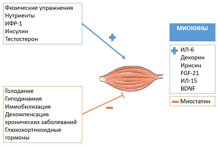 Адаптируясь к механическим, нервным и гуморальным воздействиям, скелетная мускулатура играет решающую роль в обеспечении физической активности, расходовании энергии и утилизации глюкозы [9]. Физические упражнения и анаболические гормоны, такие как инсулин, инсулиноподобный фактор роста 1, гормон роста и тестостерон, увеличивают массу скелетных мышц. И наоборот, гиподинамия, развивающаяся вследствие нервно-мышечных заболеваний, старения, хронических заболеваний (почечная недостаточность, дыхательная недостаточность, тяжелый сахарный диабет, гиперкортицизм и др.) приводит к дефициту и атрофии мышц (рис. 1).