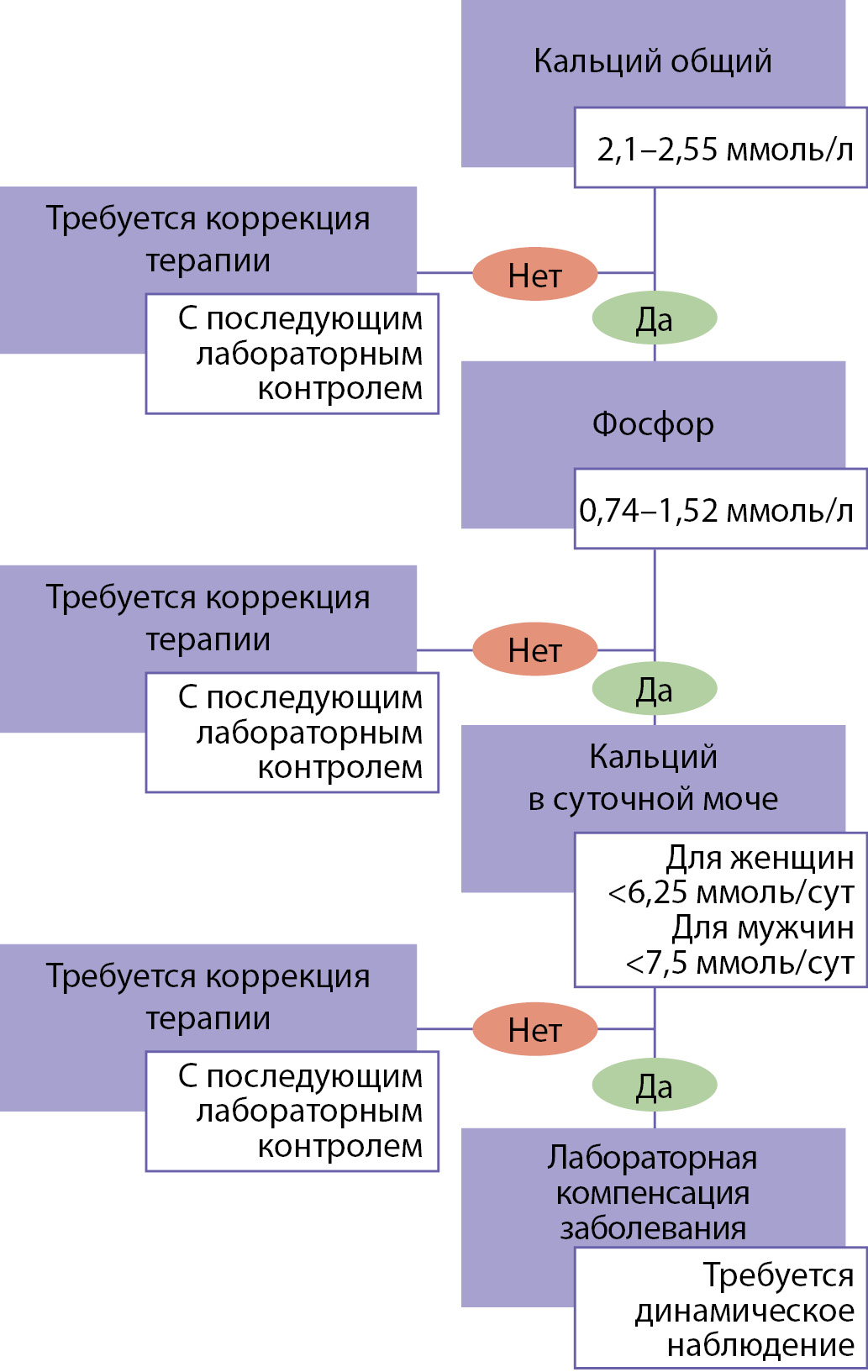 В предлагаемом алгоритме СППР анализируются показатели фосфорно-кальциевого обмена, их отклонение от референсного диапазона (внесенного специалистом или преднастроенного**, если данные не внесены), на основании чего формируются «подсказки» по коррекции терапии и дообследованию.