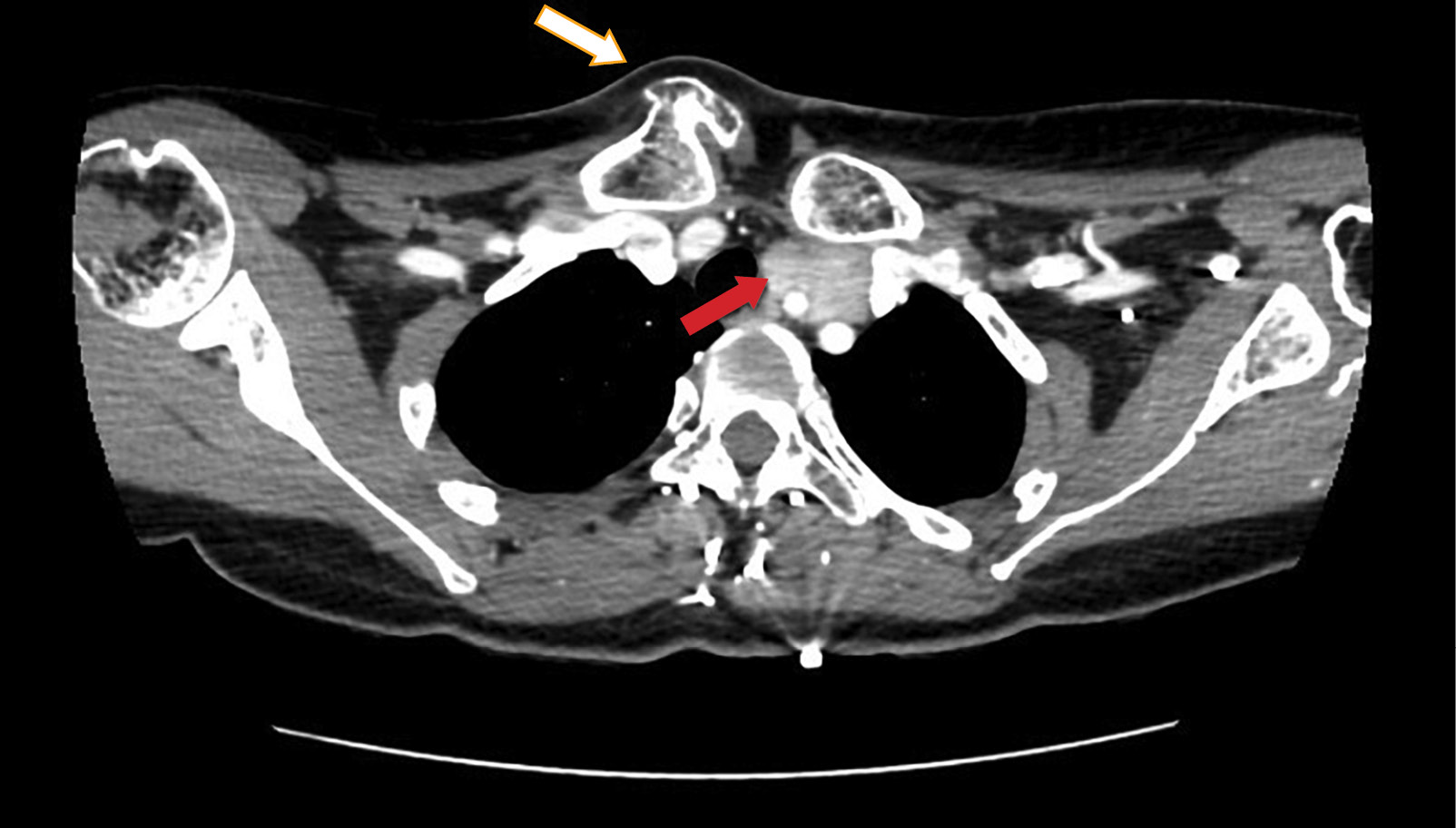 Рисунок 1. Мультиспиральная компьютерная томография шеи и верхнего средостения пациентки С. с контрастированием (белой стрелкой указана деформация правой ключицы, красной стрелкой — образование левой околощитовидной железы).