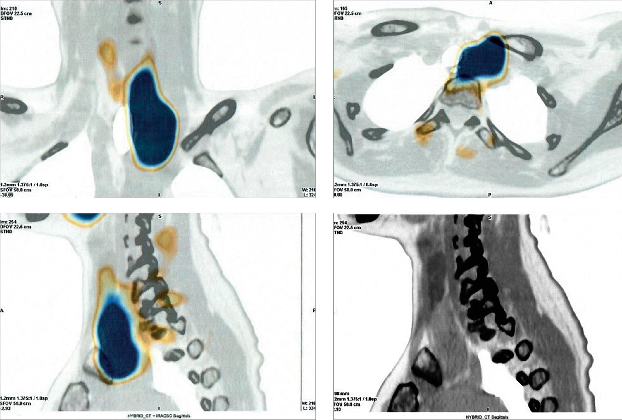 Позади нижней трети правой доли щитовидной железы обнаружена овоидная структура с четкими ровными контурами 4×6×15 мм, низкоинтенсивно накапливающая радиофармпрепарат (РФП). Кзади и книзу от левой доли, латеральнее пищевода, определяется овоидная структура с нечеткими, ровными контурами 8×10×38 мм, накапливающая РФП. Латеральнее нее визуализирована крупная мягкотканная структура с четкими ровными контурами 22×30×53 мм, распространяющаяся от нижнего полюса левой доли книзу до уровня дуги аорты, накапливающая РФП.