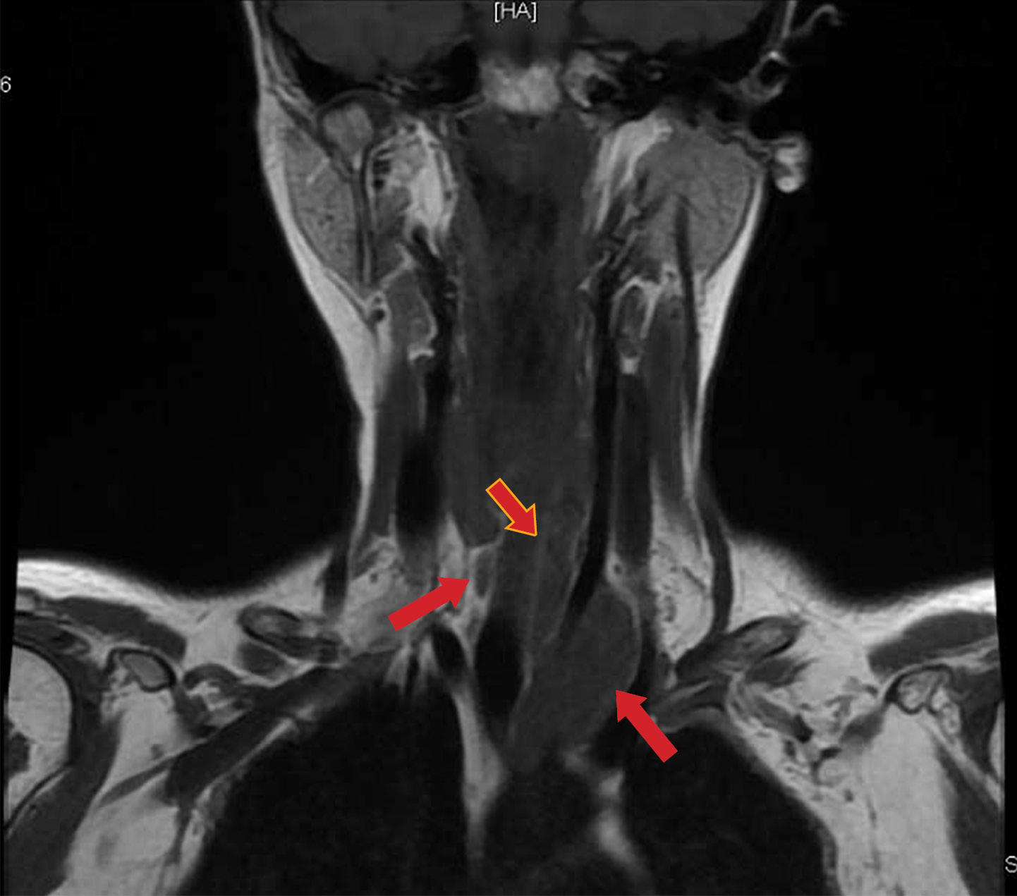 Рисунок 3. Диффузионная магнитно-резонансная томография шеи (красными стрелками указаны образования правой и левых околощитовидных желез).