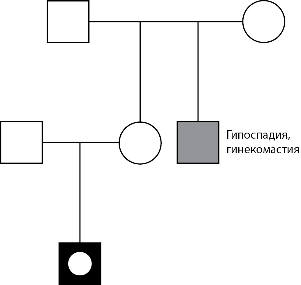 Пациент М.: при рождении диагностирована мошоночная форма гипоспадии, двусторонний паховый крипторхизм, в ходе цитогенетического исследования установлен кариотип 46,XY, на основании чего пациент зарегистрирован в мужском паспортном поле. Из анамнеза известно, что брак родителей не близкородственный, семейный анамнез отягощен (дядя по материнской линии оперирован по поводу гипоспадии и гинекомастии) (рис. 1). В допубертатном возрасте проведены оперативные вмешательства: двусторонняя орхипексия и пластика уретры в 3 этапа. С 11-летнего возраста отмечено прогрессирующее развитие грудных желез, перераспределение подкожно-жировой клетчатки по феминному типу. При обследовании в возрасте 13 лет: половое развитие по Таннеру: G2Р2B3, половой член искривлен, длина до 3 см, кавернозные тела развиты слабо, тестикулы в мошонке, D=S ~6–8 мл, в гормональном профиле: лютеинизирующий гормон (ЛГ) — 5,0 Ед/л (2,5–11,0), фолликулостимулирующий гормон (ФСГ) — 0,9 Ед/л (1,55–9,74), тестостерон — 17,8 нмоль/л (мальчики II ст. по Таннеру 0,9–12,5), эстрадиол — 120 пмоль/л (мальчики II ст. по Таннеру 20–100). По данным ультразвукового исследования малого таза: дериваты мюллеровых протоков не визуализировались. При проведении пробы с хорионическим гонадотропином отмечено адекватное повышение андрогенов (тестостерона — с 17,8 до 35,2 нмоль/л, андростендиона — с 7,7 до 11,4 нмоль/л), что позволило исключить нарушение биосинтеза тестостерона как возможную причину НФП. На основании полученных данных диагностирован «синдром резистентности к андрогенам, парциальная форма». Учитывая мужской пол воспитания, проведена двусторонняя мастэктомия, к терапии добавлены блокаторы ароматазы.
