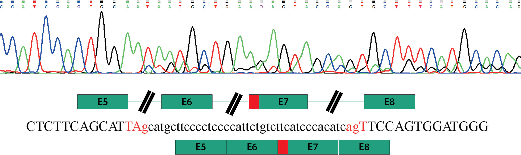 Рисунок 2. Аберрантный сплайсинг при секвенировании кДНК из фибробластов кожи мошонки.