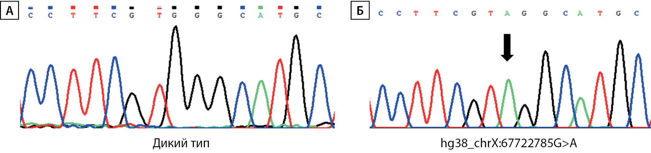 А — фрагмент геномной последовательности дикого типа в интроне 6 (hg38_chrX:67722778-67722792); Б — гемизиготная транзиция hg38_chrX:67722785G>A (указано стрелкой), располагающаяся в интроне 6, на дистанции в 42 нуклеотидных основания перед началом экзона 7 (с.2450-42 G>A)