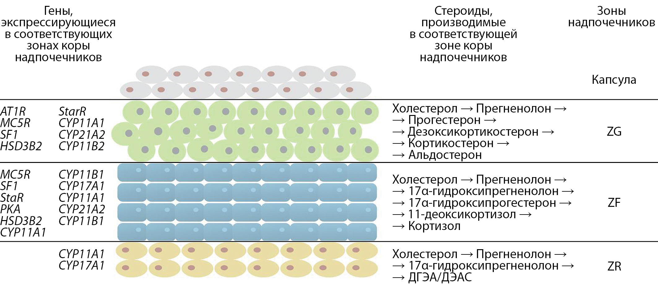 Рисунок 1. Схема строения коры надпочечников человека с указанием зон, а также основных генов и стероидов каждой зоны.
