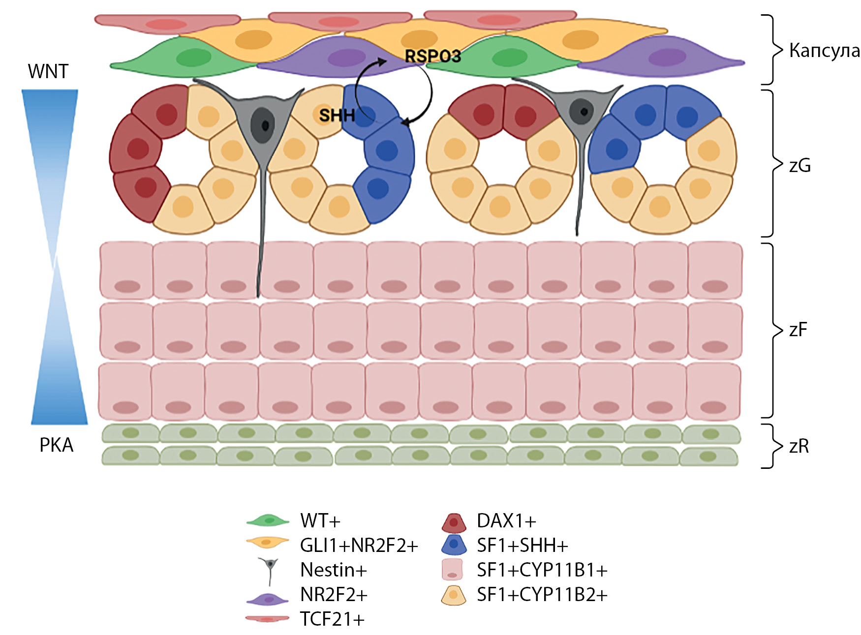 Надпочечники — это парные эндокринные органы, расположенные по одному в забрюшинном пространстве, топографо-анатомически над верхними полюсами почек, производящие стероидные гормоны и катехоламины. Железы состоят из двух частей различного эмбрионального происхождения: внешнего слоя — коркового вещества и центральной зоны — мозгового вещества. Кора надпочечников, о которой идет речь в данном обзоре, производит три типа стероидов: минералокортикоиды, глюкокортикоиды и андрогены. Производство гормонов разделено физиологически и регулируется независимыми петлями эндокринной обратной связи: ренин-ангиотензин-альдостероновой системой (РААС) и гипоталамо-гипофизарно-надпочечниковой осью (ГГН), которые контролируют выработку минералокортикоидов и глюкокортикоидов/андрогенов соответственно. Эта функциональная компартментализация отражена гистологически, так как кора разделена на три отдельные гистологические зоны в центростремительном направлении: клубочковая зона (zona glomerulosa, zG), пучковая зона (zona fasciculata, zF) и сетчатая зона (zona reticularis, zR). Кроме того, надпочечник окружен капсулой, содержащей стволовые клетки, под которой в zG располагаются субкапсулярные клетки-прогениторы. Паракринные пути передачи сигналов, поддерживаемые популяциями стволовых клеток/прогениторов, о которых речь пойдет ниже, и включающие гетеротипические клеточные взаимодействия, являются основными детерминантами анатомической и функциональной зональности надпочечников (рис. 1).
