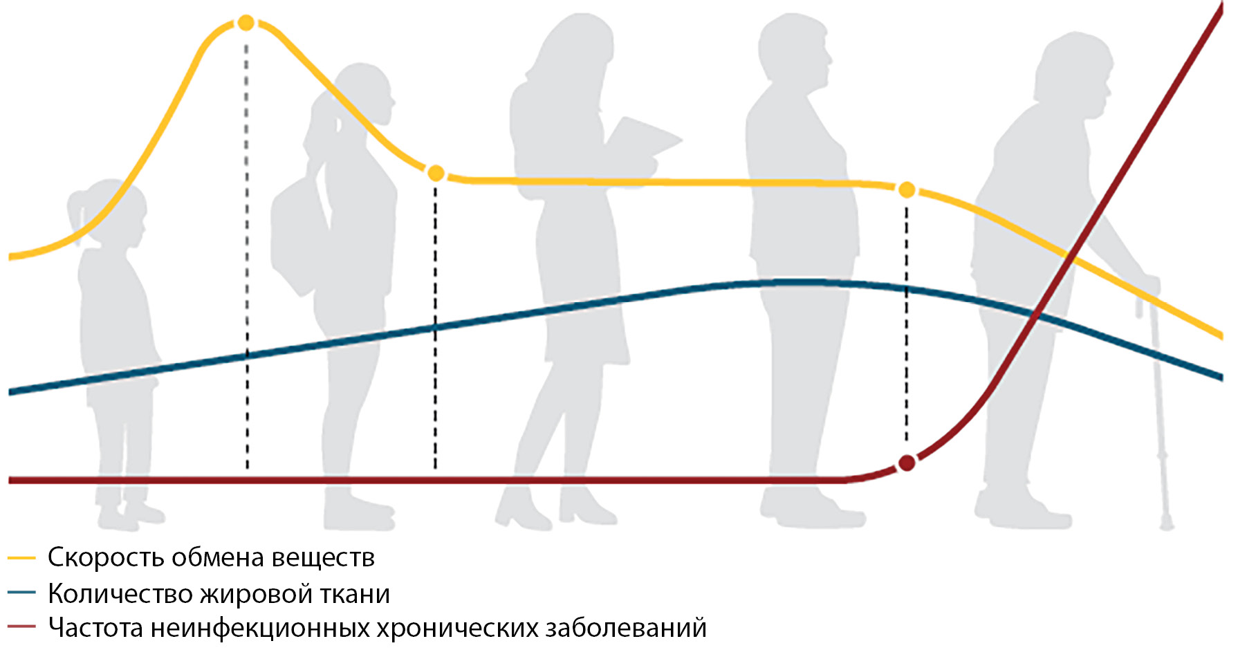 Результаты самого большого на сегодняшний день популяционного исследования с применением метода двойной меченой воды опубликованы в августе 2021 г. в журнале Science [9]. Эти уникальные данные, полученные Г. Понцером и соавт. при анализе энергетических затрат более чем у 6400 здоровых мужчин и женщин из 29 стран мира в возрасте от 8 дней до 95 лет, продемонстрировали изменения уровня метаболизма во время роста, развития и старения. Уровень основного обмена был скорректирован на безжировую («fat-free mass») массу тела, чтобы учесть различия композиционного состава тела, гендерные особенности, изменения в метаболическом статусе на протяжении жизни. Ожидаемо, общие энергозатраты увеличивались параллельно росту безжировой массы тела. Авторы выделили 4 основных периода значимых изменений энергетического обмена человека. Первый период — младенческий — от рождения до 1 года. Скорость обмена веществ (СЭО и ОО) у новорожденных соответствует уровню взрослого человека, к 1 году жизни быстро увеличивается и становится практически в два раза выше, чем у взрослых, достигая пика к 7 мес. Далее к 20 годам отмечается медленное снижение уровня метаболизма (причем у детей в возрасте от 10 до 15 лет не наблюдалось пубертатного увеличения уровня обмена), а в возрасте от 20 до 60 лет выходит на уровень плато и остается стабильным даже во время беременности и после родов. При многомерной регрессии в возрасте от 1 года до 20 лет у лиц мужского пола показатели обмена были более высокими, тогда как в старших группах пол не оказал заметного влияния на скорость снижения СЭО с возрастом. И наконец, у пожилых людей отмечается постепенное снижение уровня энергетического обмена, несмотря на отсутствие изменений в процентном содержании жировой ткани. Кроме того, данный период сопряжен с увеличением частоты хронических заболеваний (рис. 1).