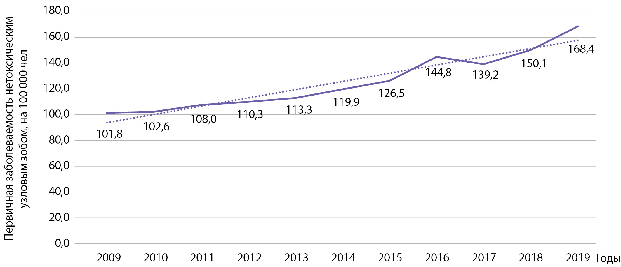 3. Рисунок 3. Динамика заболеваемости нетоксическим узловым зобом на 100 000 человек.