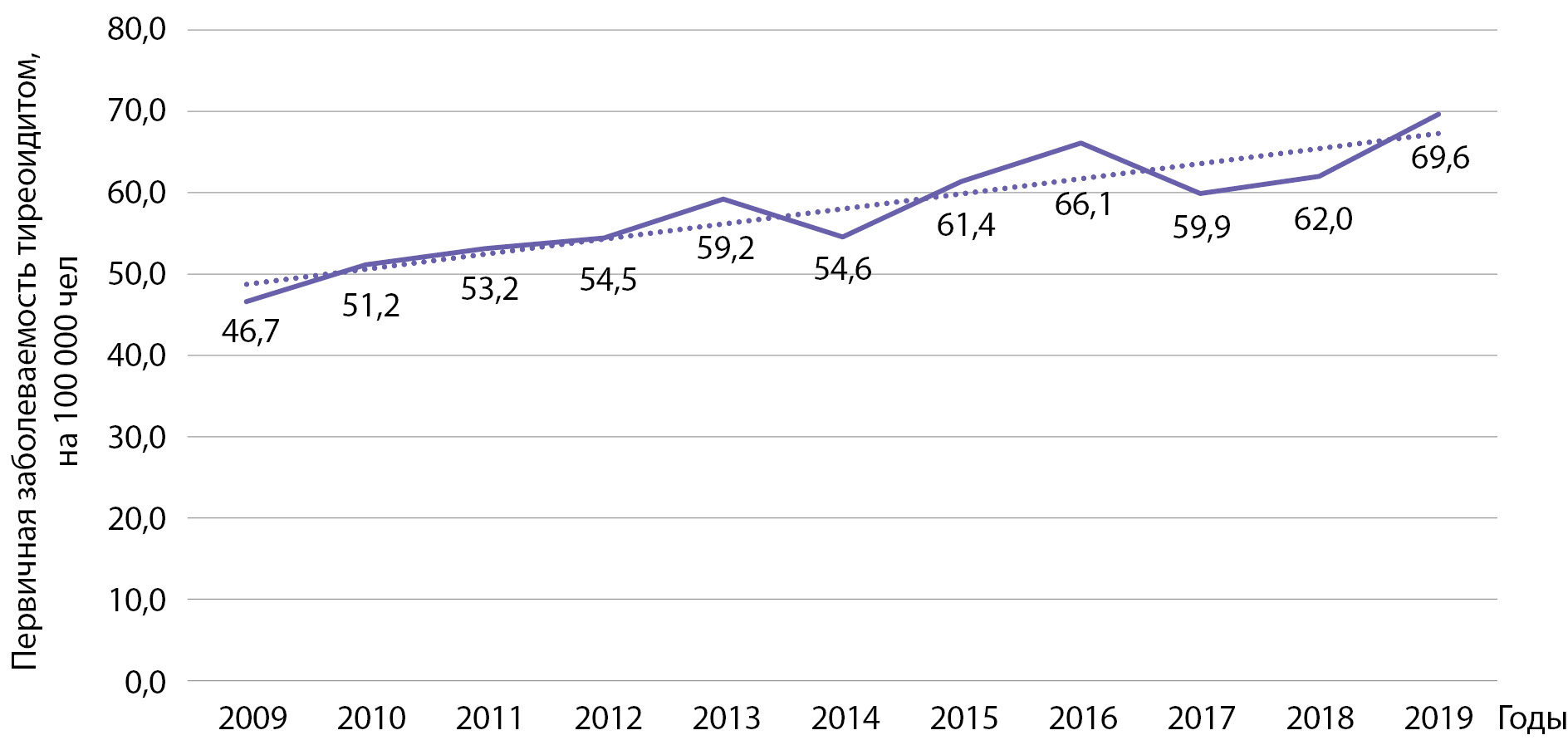 Согласно нашим данным, первичная заболеваемость на территории Республики Беларусь тиреоидитом выросла у взрослых с 46,7 на 100 000 населения в 2009 г. до 69,6 на 100 000 населения в 2019 г. (рис. 5). Проведенный анализ показал статистически значимый рост заболеваемости указанной патологией: b=1,85 при р=0,0001; R2=0,828. Кумулятивная заболеваемость за указанный период времени составила 632,0 на 100 000 населения.