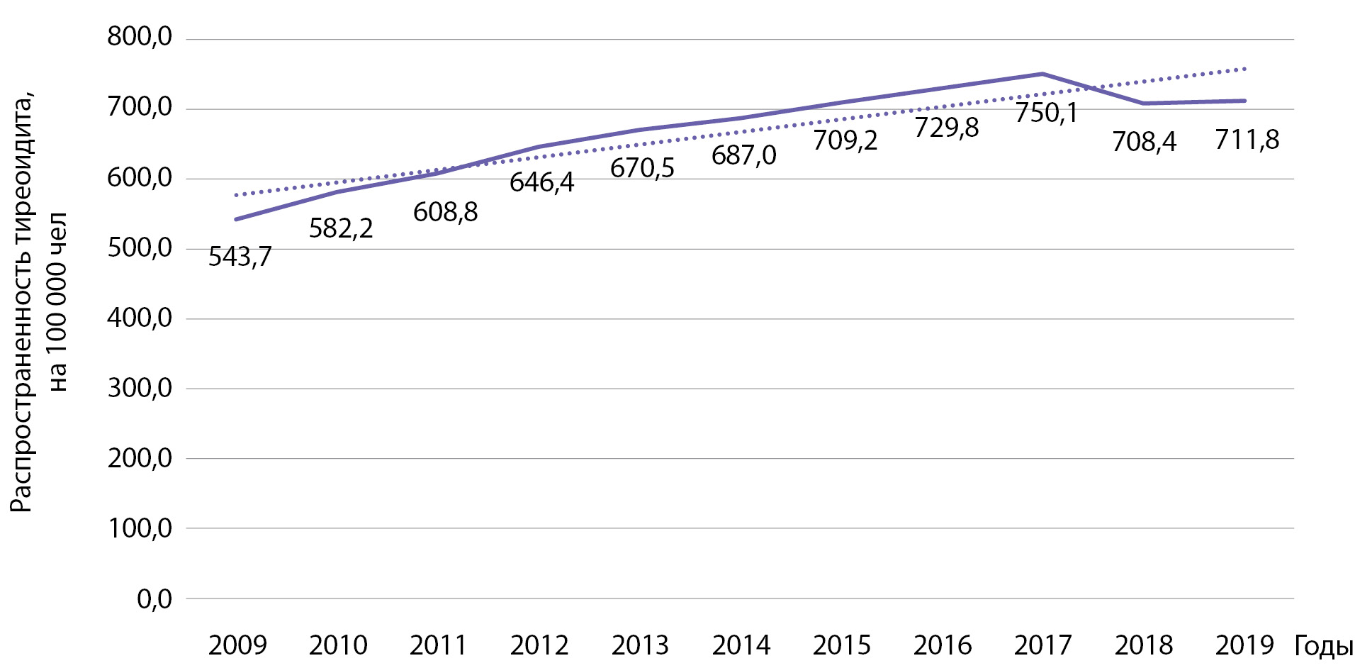 Распространенность тиреоидита за этот же период времени выросла с 543,7 до 711,8 на 100 000 населения (рис. 6). Анализ выявил статистически значимый рост распространенности указанной патологии: b=18,0 при р=0,0001; R2=0,825.