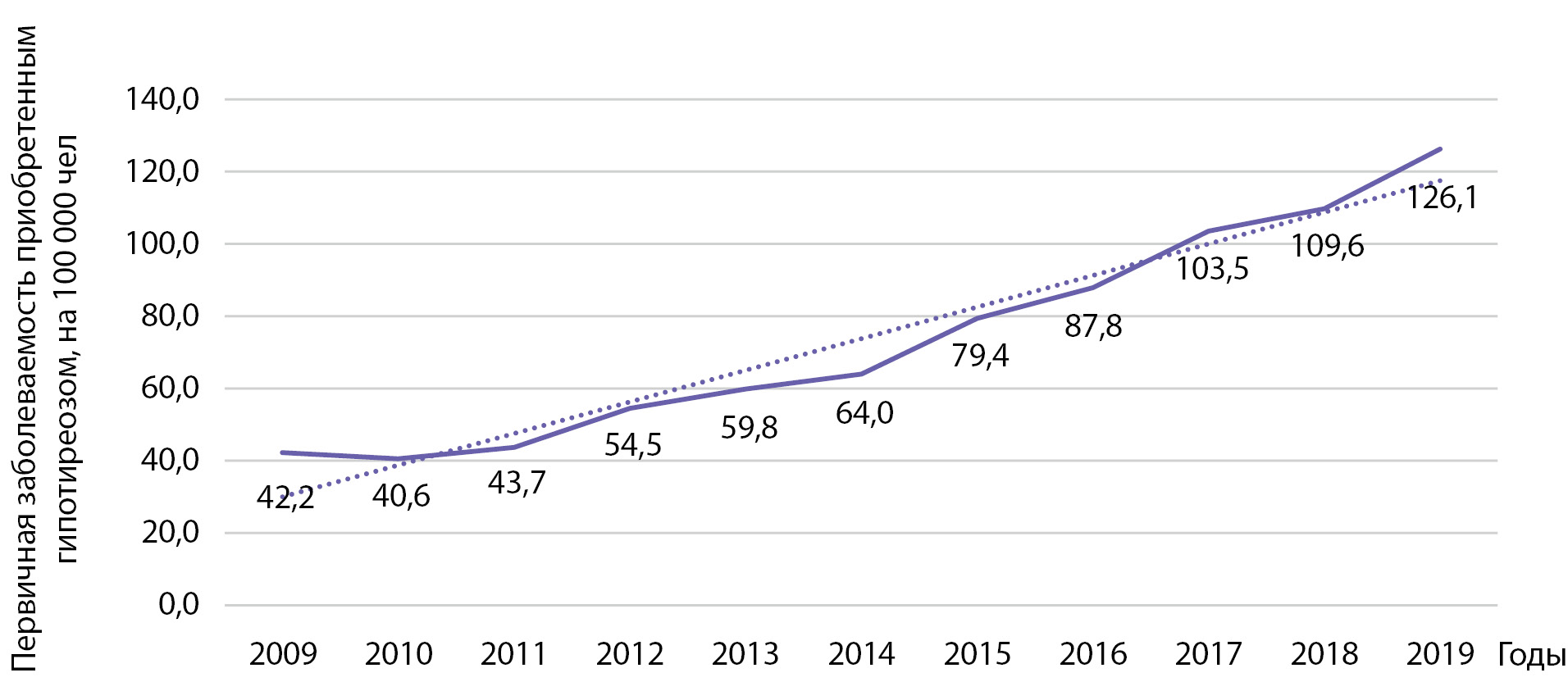 Первичная заболеваемость приобретенным гипотиреозом выросла с 42,2 на 100 000 населения в 2009 г. до 126,1 на 100 000 населения в 2019 г. (рис. 7). Был установлен статистически значимый рост заболеваемости указанной патологией: b=8,7 при р=0,0000002; R2=0,955. Кумулятивная заболеваемость за указанный период времени составила 801,93 на 100 000 населения.