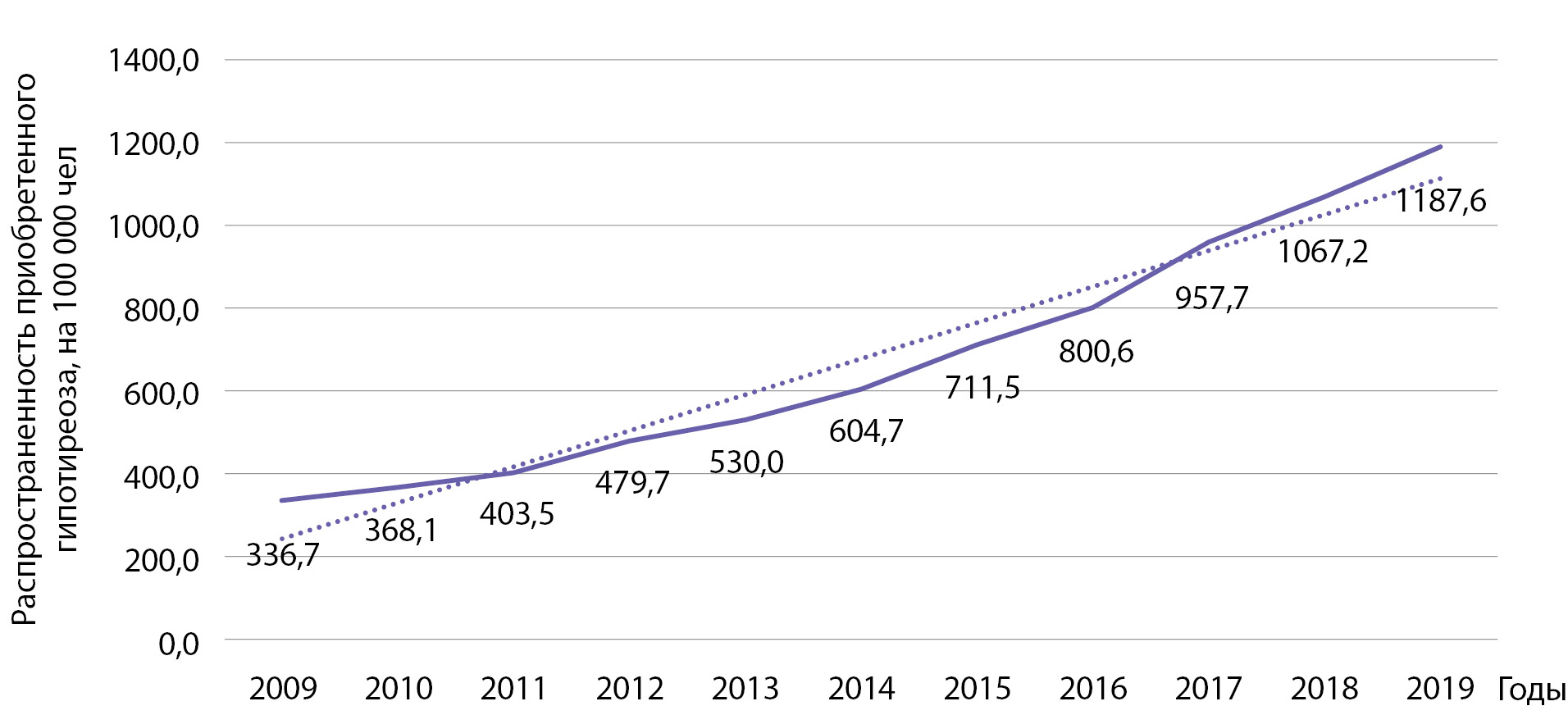 Распространенность гипотиреоза за этот же период времени выросла с 336,7 до 1187,6 на 100 000 населения (рис. 8). Выявлен статистически значимый рост распространенности указанной патологии: b=87 при р=0,0000001; R2=0,961.