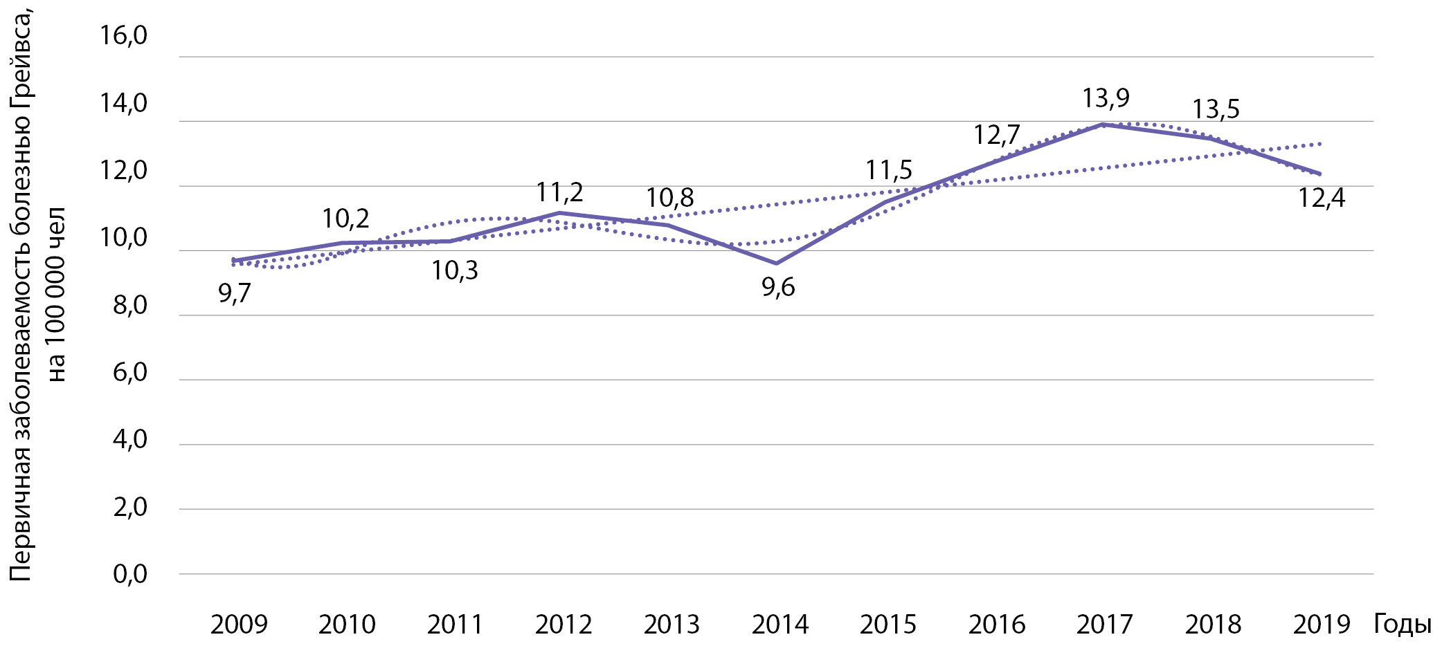 9. Рисунок 9. Динамика заболеваемости болезнью Грейвса на 100 000 человек.