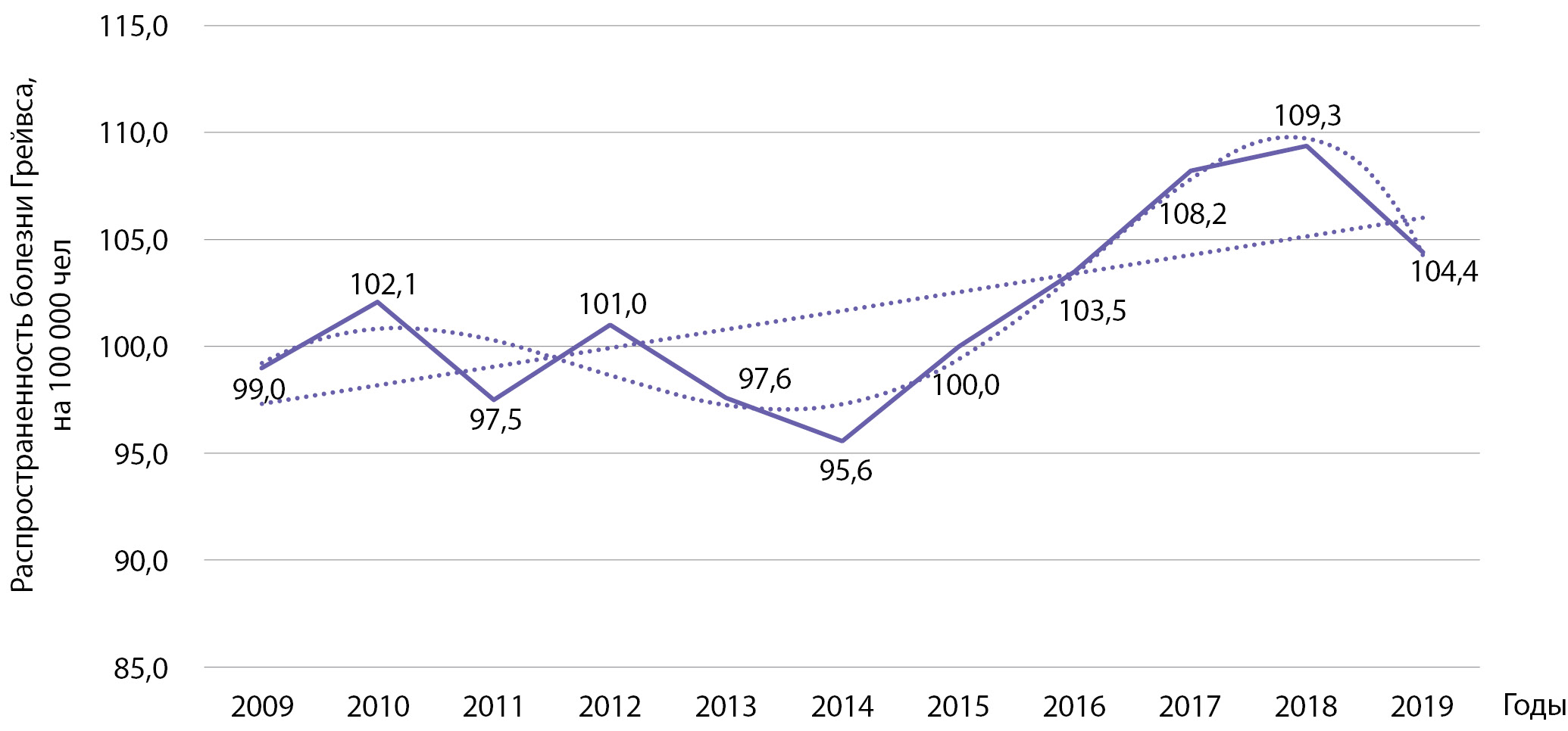 Распространенность болезни Грейвса за этот же период времени выросла с 99,0 до 104,4 на 100 000 населения (b=0,865 при р=0,029; R2=0,427 (рис. 10). При использовании полинома 5-й степени коэффициент детерминации R² составил 0,904 (р=0,035).
