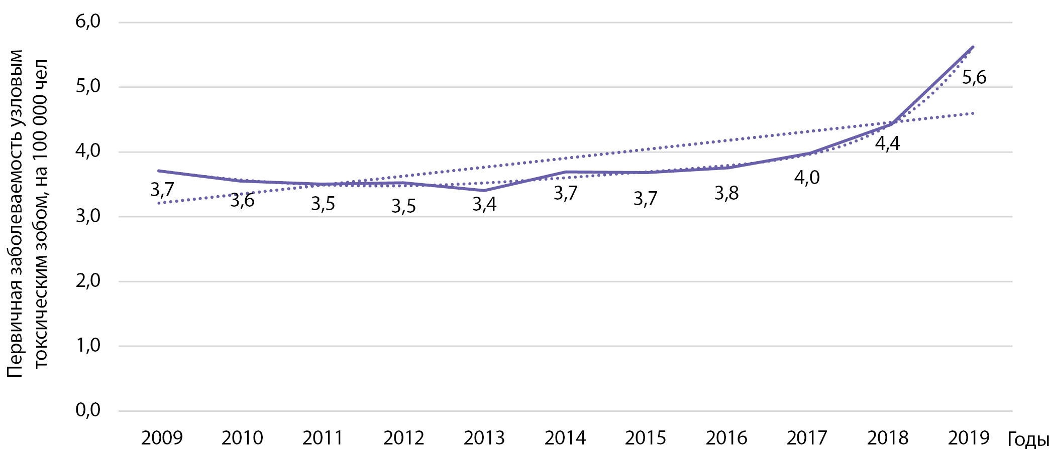 Рисунок 11. Динамика заболеваемости узловым токсическим зобом на 100 000 человек.