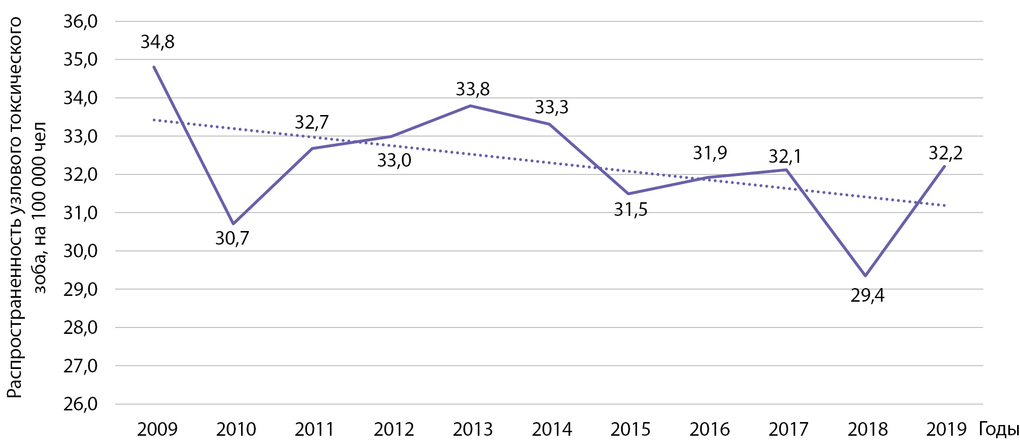 Распространенность узлового токсического зоба за этот же период времени уменьшилась с 34,8 до 32,2 на 100 000 населения (рис. 12). Анализ не позволил установить наличие линейного тренда: b=0,221 при р=0,121; R2=0,246.