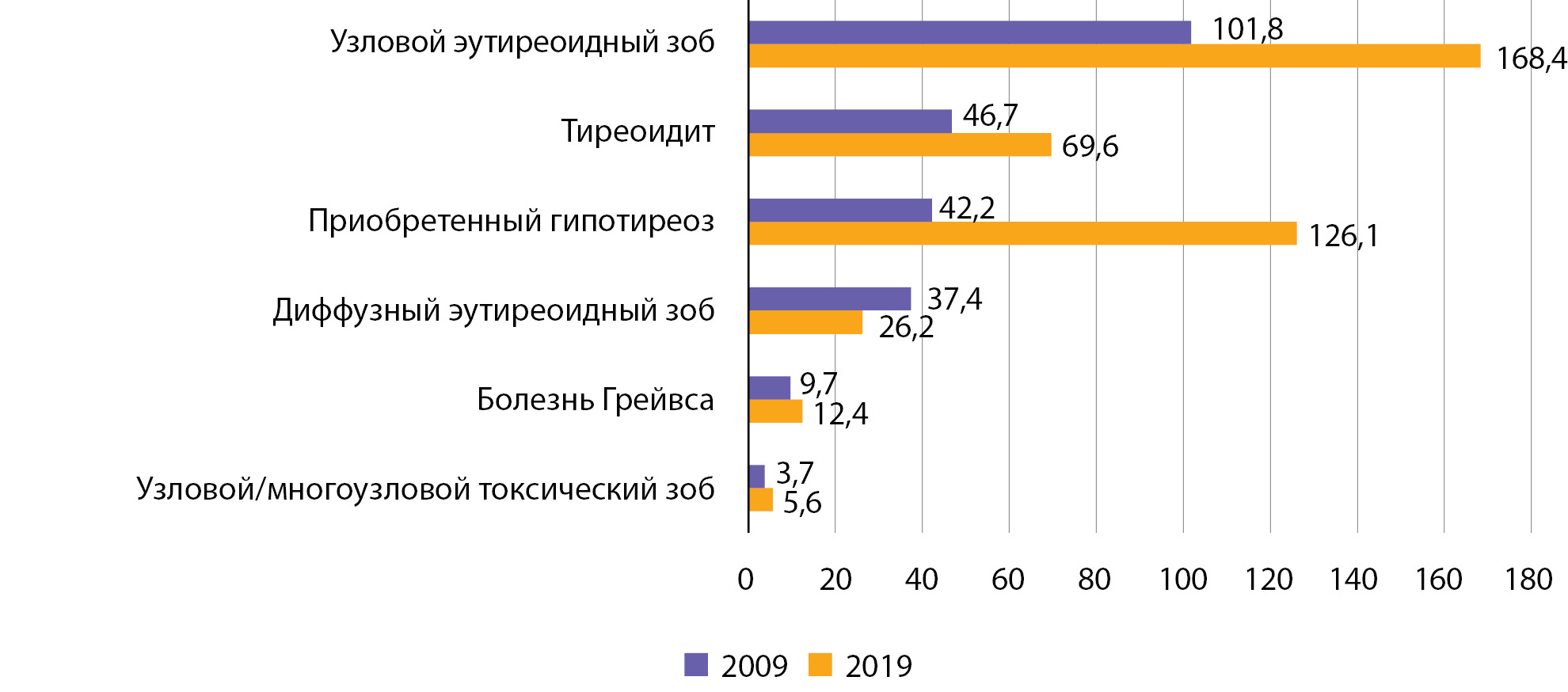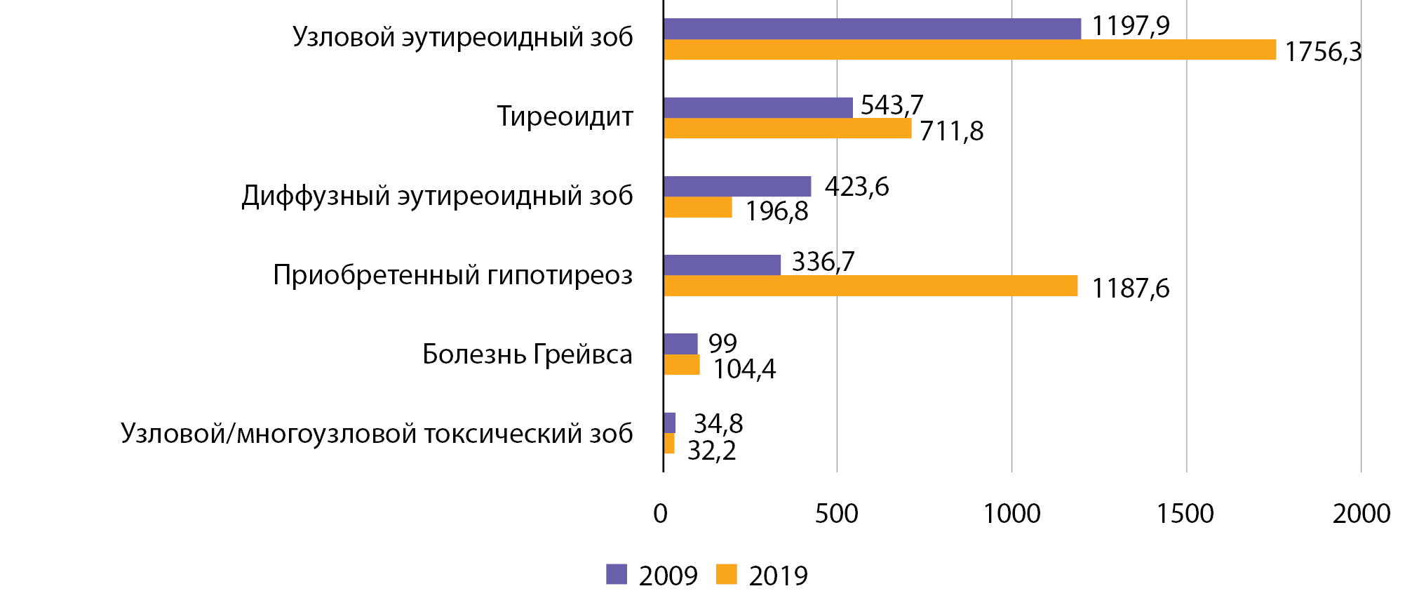 Заболевания были разделены по группам в соответствии с используемой в статистической отчетности структурой, базирующейся на международной классификации болезней 10-го пересмотра: приобретенный гипотиреоз (Е02–03), нетоксический диффузный зоб (Е04.0), нетоксический одноузловой и многоузловой зоб (Е04.1–Е04.2), тиреотоксикоз (гипертиреоз) с токсическим одноузловым и многоузловым зобом (Е05.1–Е05.2), тиреоидит (Е06), тиреотоксикоз с диффузным зобом (Е05.0)