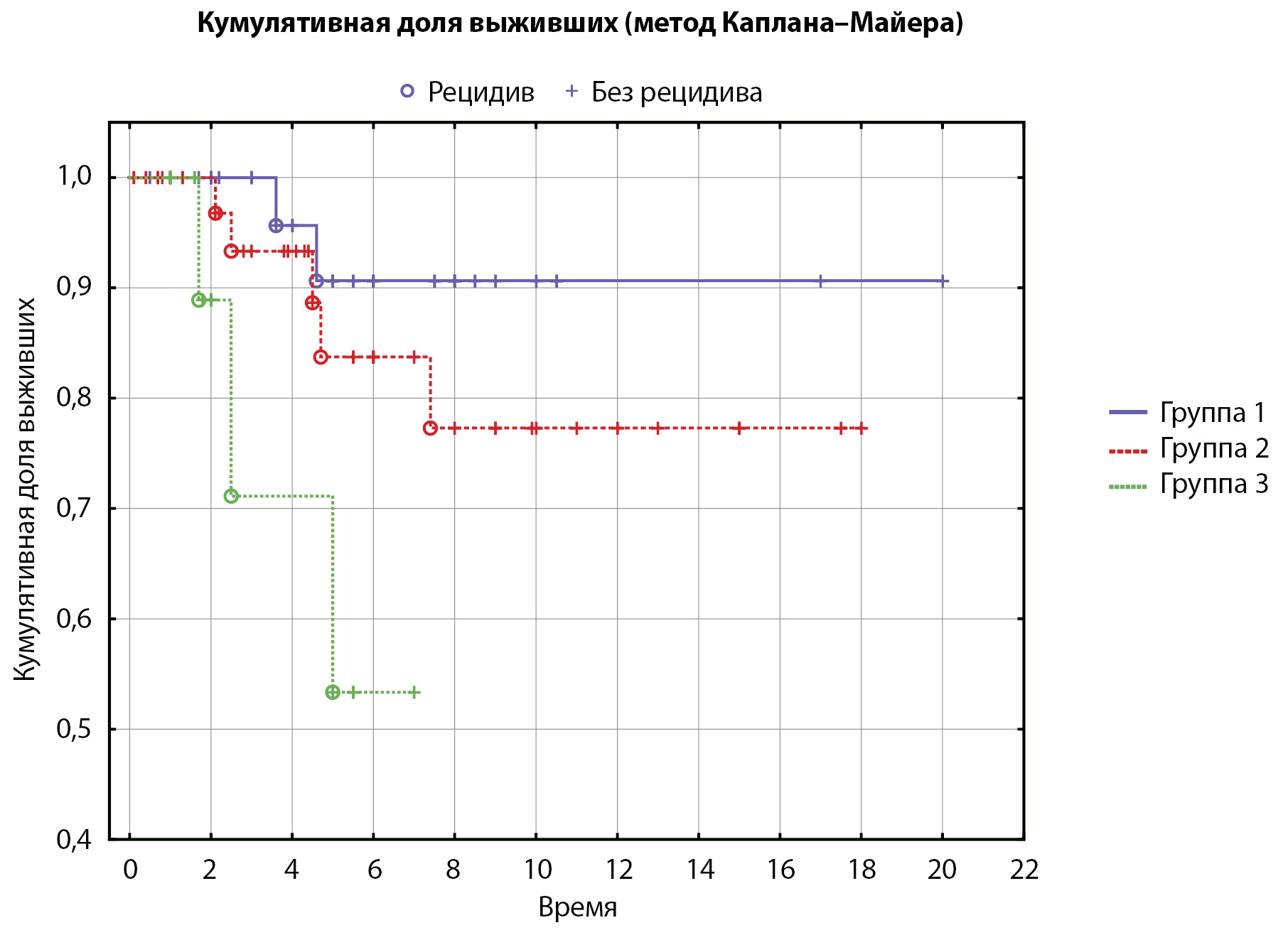 2. Рисунок 2. Время до рецидива в подгруппах, сформированных в зависимости от метода лечения (кривые Каплана–Майера, n=90). Группа 1 — пациенты после хирургического лечения (n=55, рецидив у 8 пациентов), группа 2 — после лучевого лечения на одном из этапов (n=36, рецидив у 2 пациентов). Среднее время до наступления рецидива: 1-я группа — 3,3 года, 2-я группа — 6 лет.