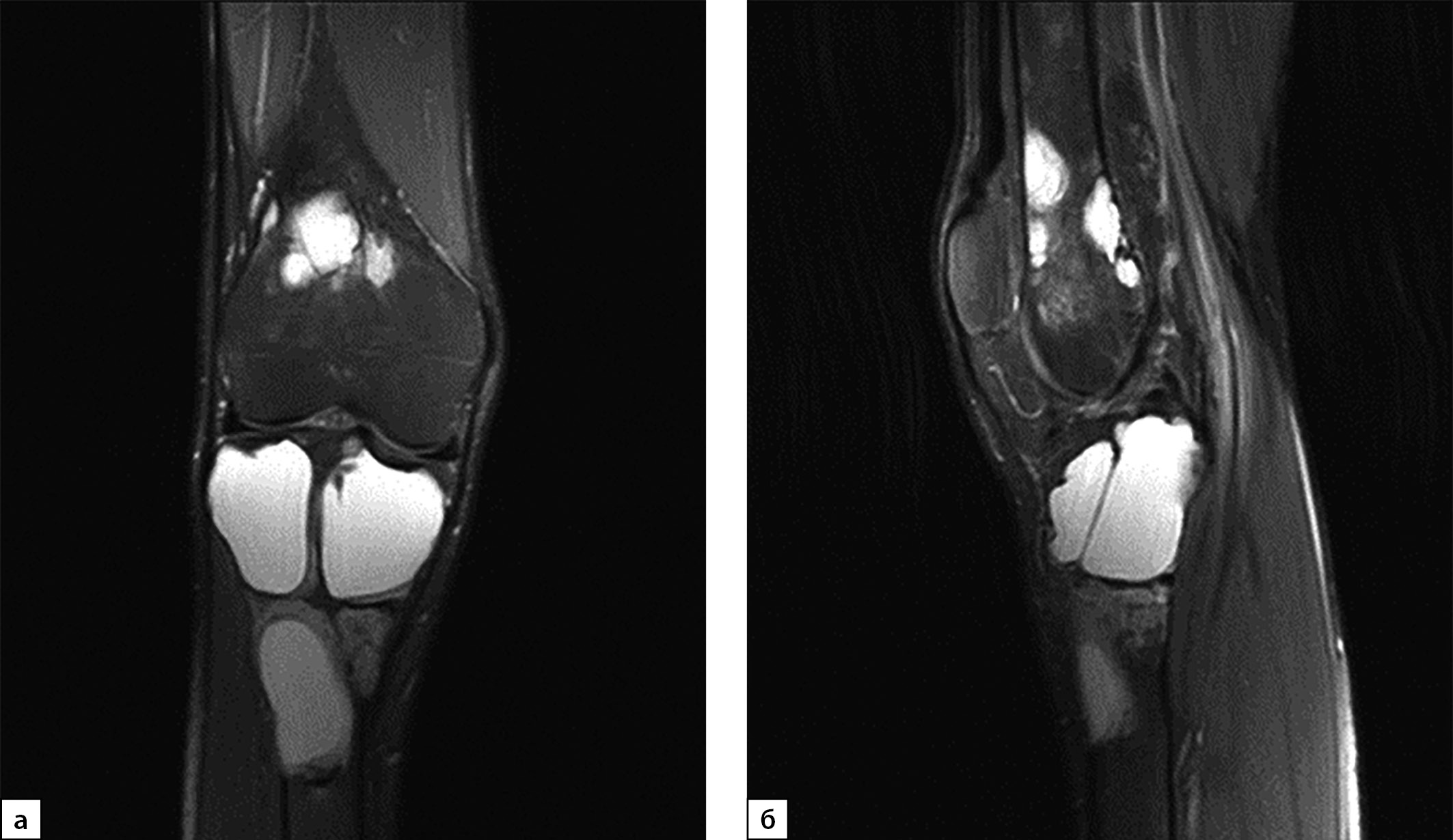 В июле 2020 г. после низкоэнергетической травмы (падения) при рентгенологическом исследовании правого коленного сустава выявлены множественные очаги деструкции костей, образующих коленный сустав. Данные изменения расценены как множественные кисты (рис. 1, а, б). По данным магнитно-резонансной томографии (МРТ) также подтверждены признаки множественных кист в дистальных метаэпифизах бедренных и проксимальных отделах большеберцовых костей с обеих сторон, справа — с разрушением кортикального слоя кости (рис. 2, а, б).