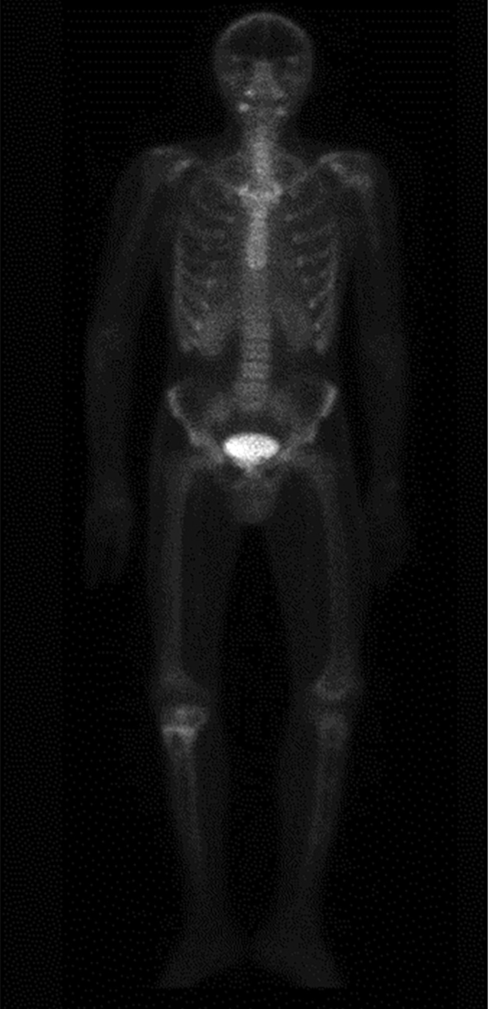 Рисунок 3. Однофотонная эмиссионная компьютерная томография с Пирфотех 99mTc всего тела: генерализованный остеобластический и остеолитический процессы в костной ткани, с наиболее выраженным проявлением в проксимальном метафизе правой большеберцовой кости.