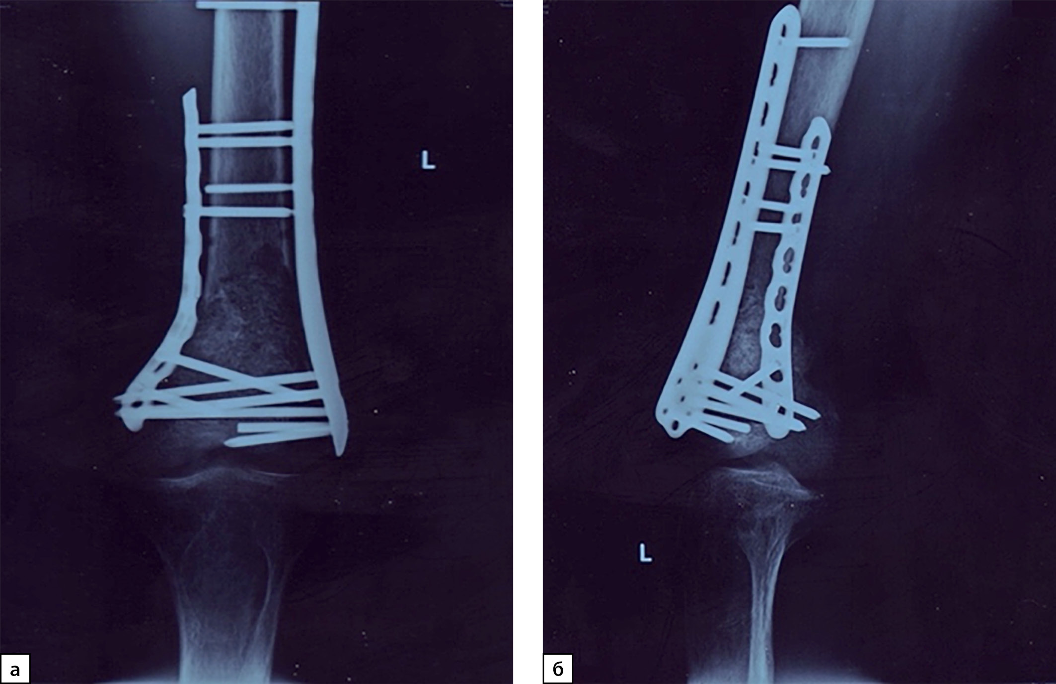 Рисунок 4. Рентгенография левого коленного сустава, 2021 г. (в прямой (а) и боковой проекциях (б)): состояние после оперативного лечения — остеосинтеза бедренной кости в нижней трети, аллопластики дефекта.