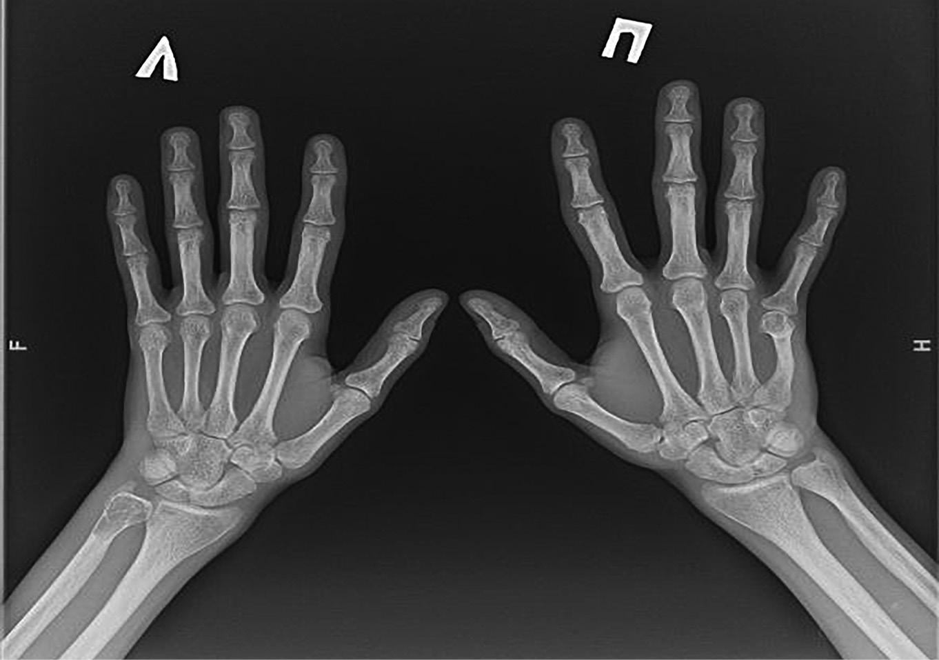 Рисунок 6. Рентгенография кистей с лучезапястными суставами. Диффузное снижение плотности костей, кистовидно-дистрофическая перестройка структуры дистального эпиметафиза левой локтевой кости с деструкциями от 3,9 мм до 10, 7 мм на фоне локальной псевдобуллизации. Справа — ульнарная девиация диафиза 5-й пястной кости с консолидированным переломом в средней трети, деформация с остеодистрофической перестройкой структуры головки и субкапитальной зоны. Перестроечные переломы в стадии консолидации диафизов 3-й и 4-й пястных костей правой кисти по медиальным поверхностям. Формирующиеся кисты в дистальных метаэпифизарных зонах лучевых костей с обеих сторон от 1 до 3 мм, а также в шиловидной зоне дистального эпифиза правой локтевой кости и в телах ладьевидной и полулунной костей правой кисти (0,5–2 мм).
