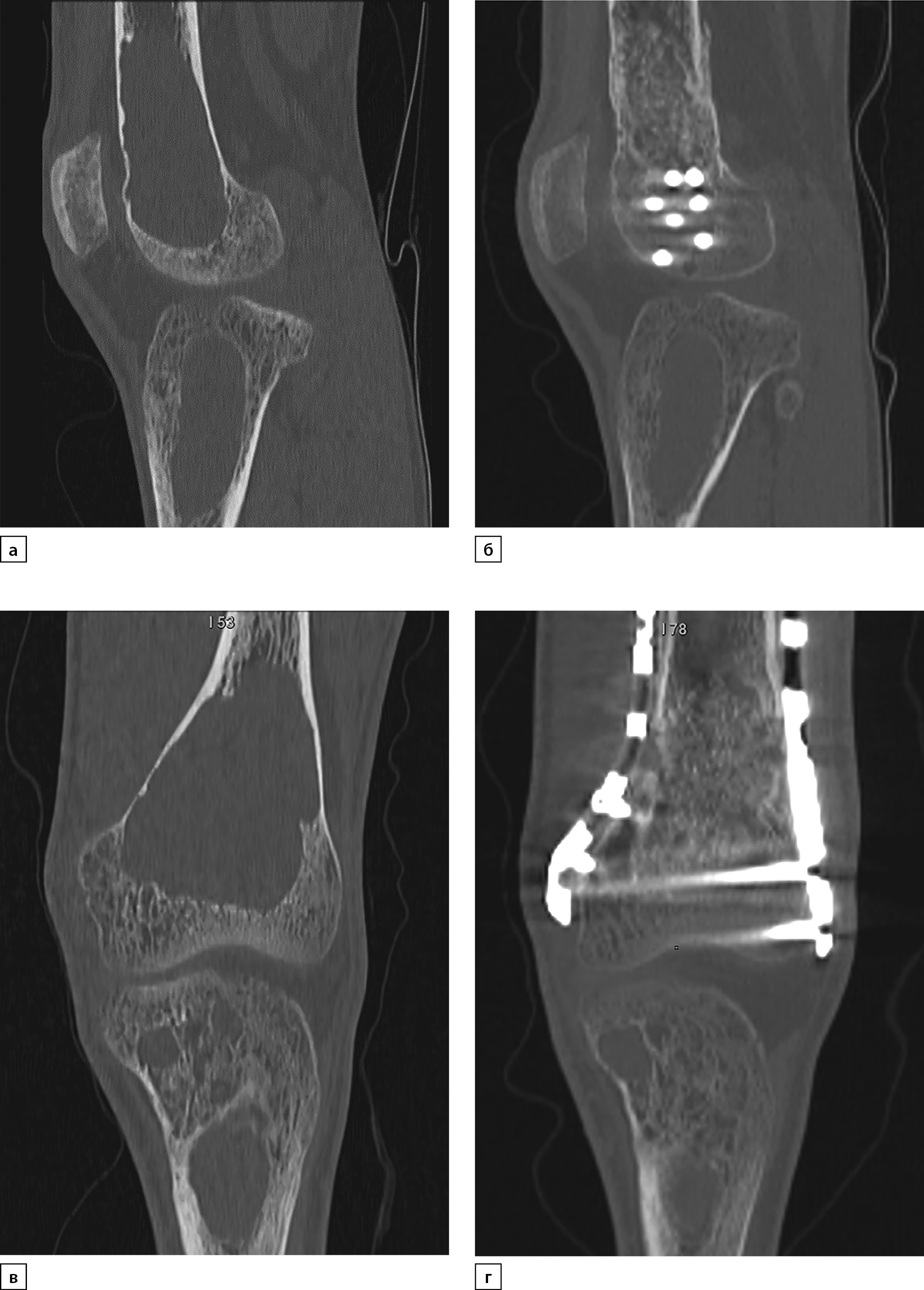 7. Рисунок 7. Мультиспиральная компьютерная томография левой бедренной кости в динамике: исходно (2020 г., а, в) и через 6 месяцев после паратиреоидэктомии (2021 г., б, г) в сагиттальной и корональной проекциях. | |