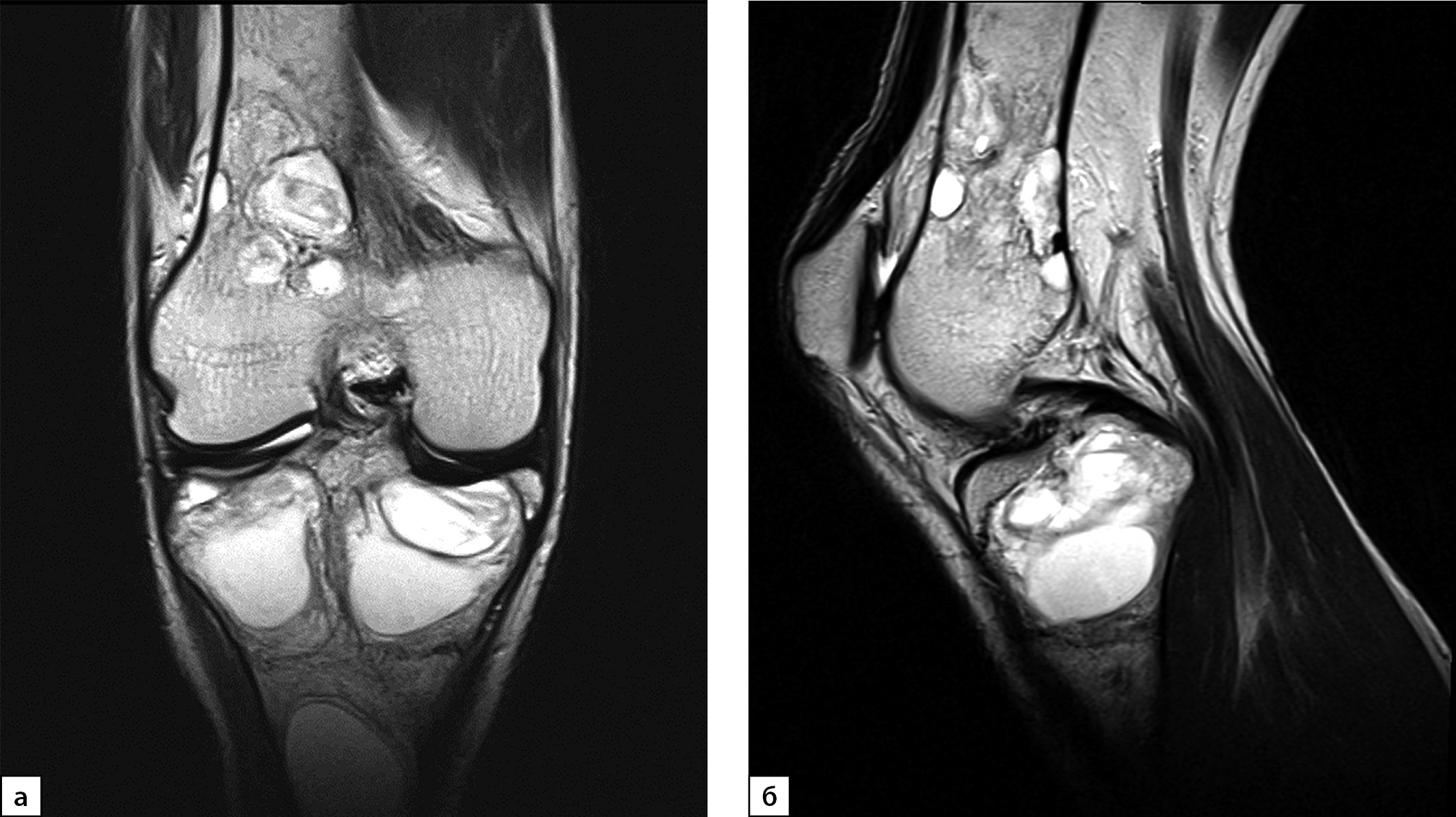 Рисунок 2. Магнитно-резонансная томография правого коленного сустава в режиме Т2, 2020 г. (в корональной (а) и сагиттальной проекциях (б)): МР-картина множественных костных кист в бедренной и большеберцовой костях. Отмечается истончение кортикального слоя кости, местами вздутие.