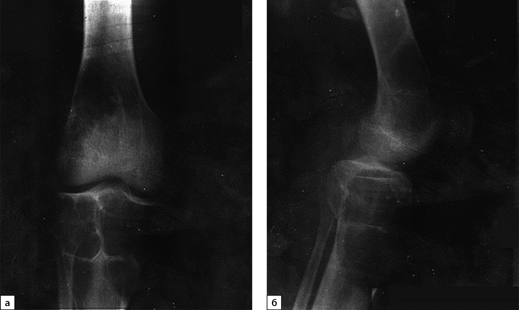 1. Рисунок 1. Рентгенография правого коленного сустава с литическими очагами бедренной и большеберцовой костей, 2020 г. (в прямой (а) и боковой проекциях (б)).