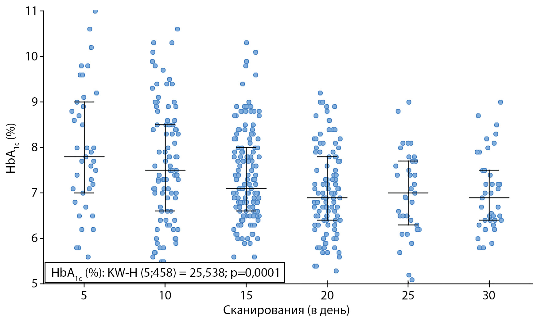 Рисунок 2. Уровень HbA1c в зависимости от частоты сканирования датчика за сутки. Данные представлены в виде: медиана (интерквартильный диапазон) и отдельные значения. Использован критерий Краскела–Уоллиса.