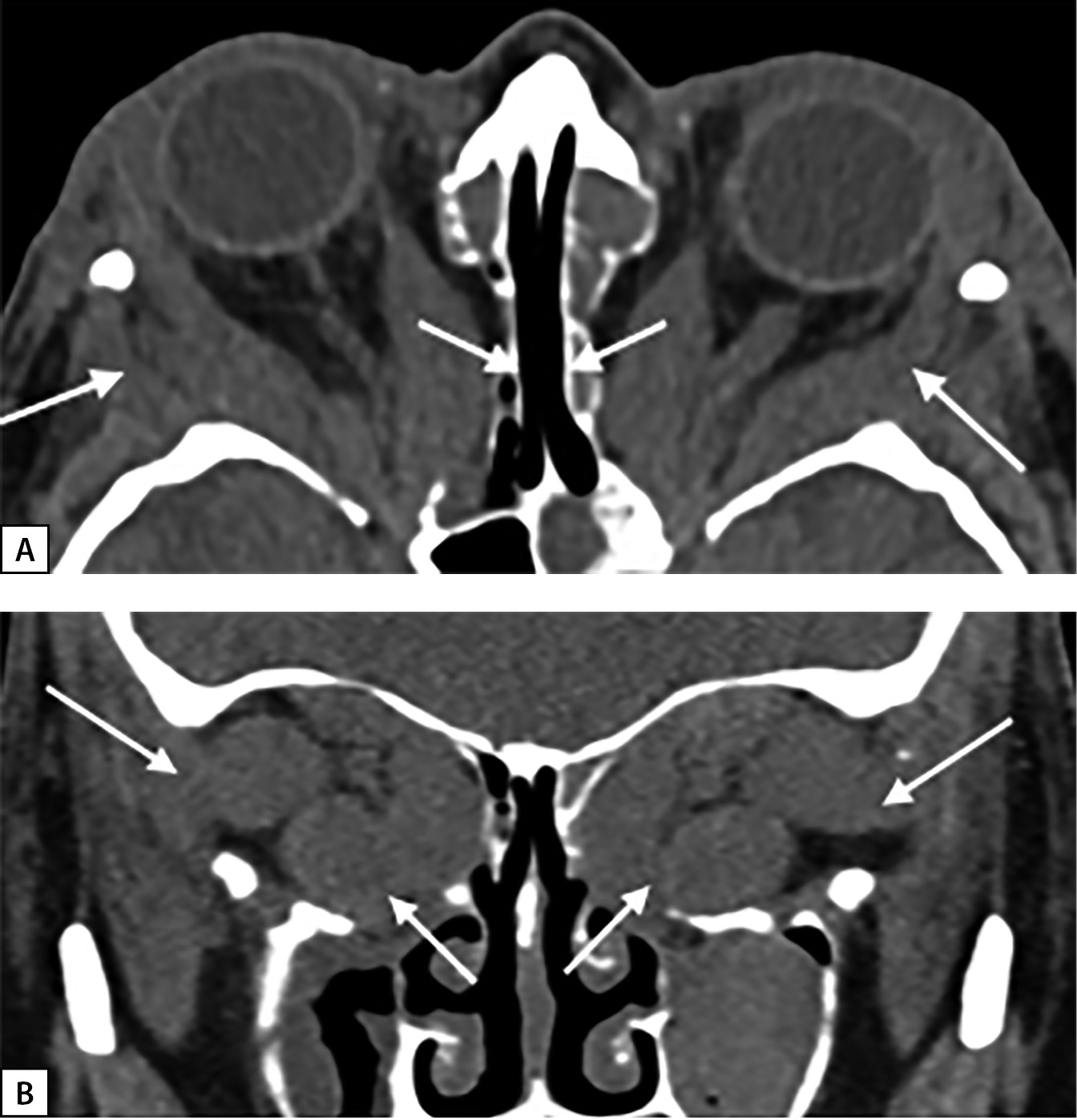 А — увеличение медиальных прямых мышц.